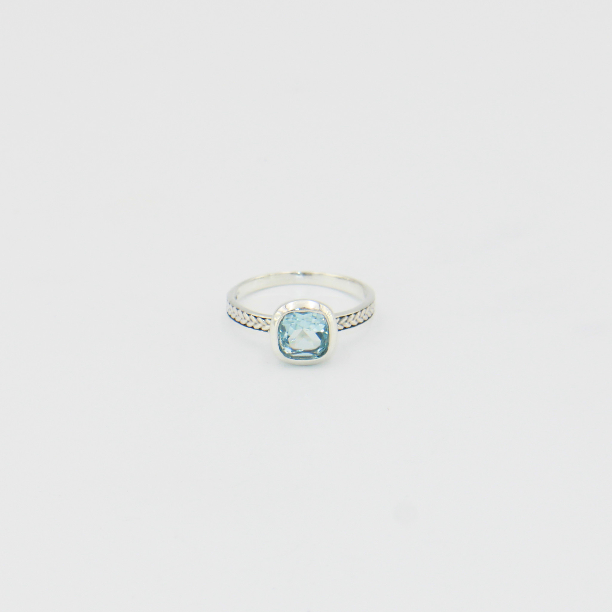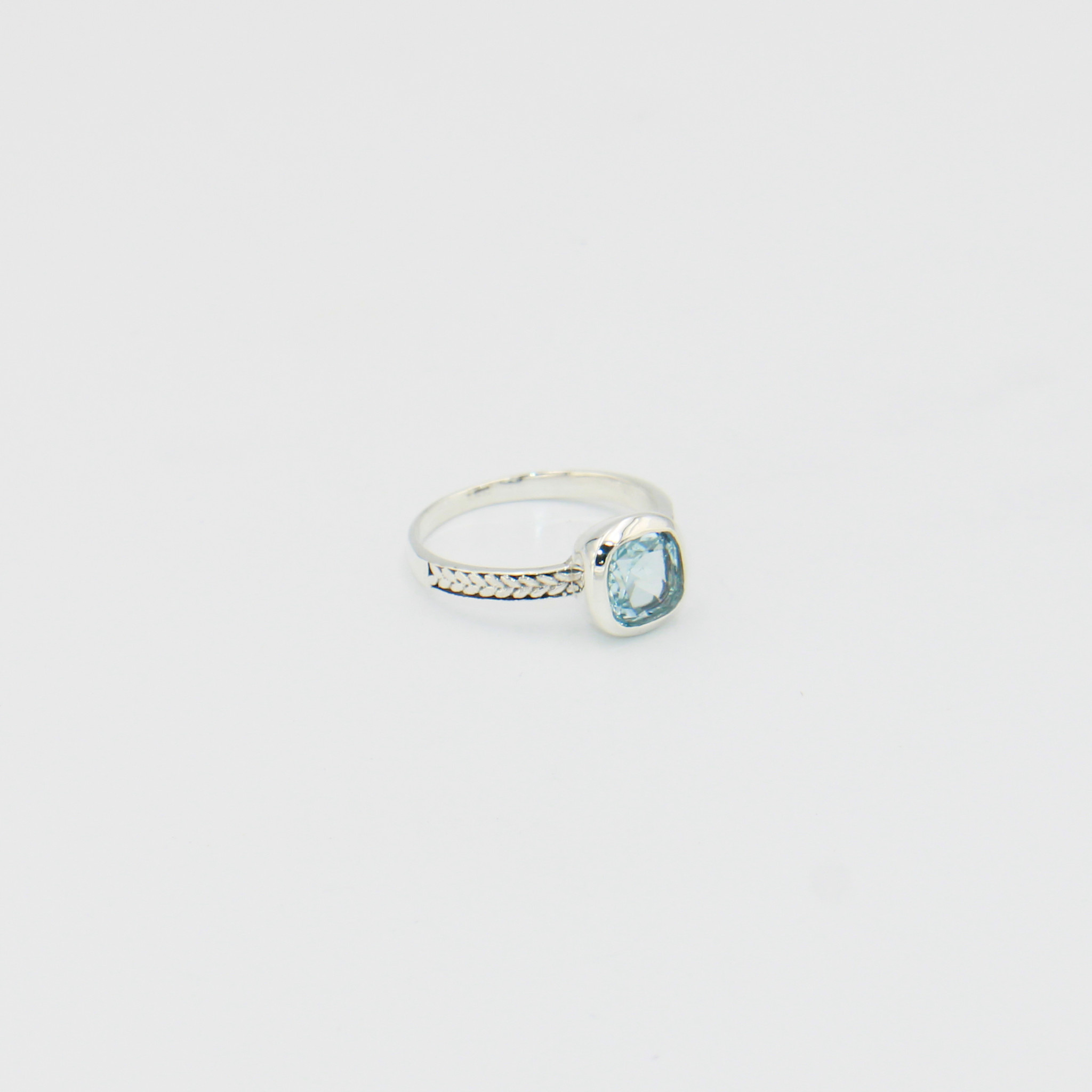 Cushion cut Blue Topaz is the star of this sterling silver ring. A dainty leaf motif on the band makes this a unique and beautiful addition to your ring collection! Size 8