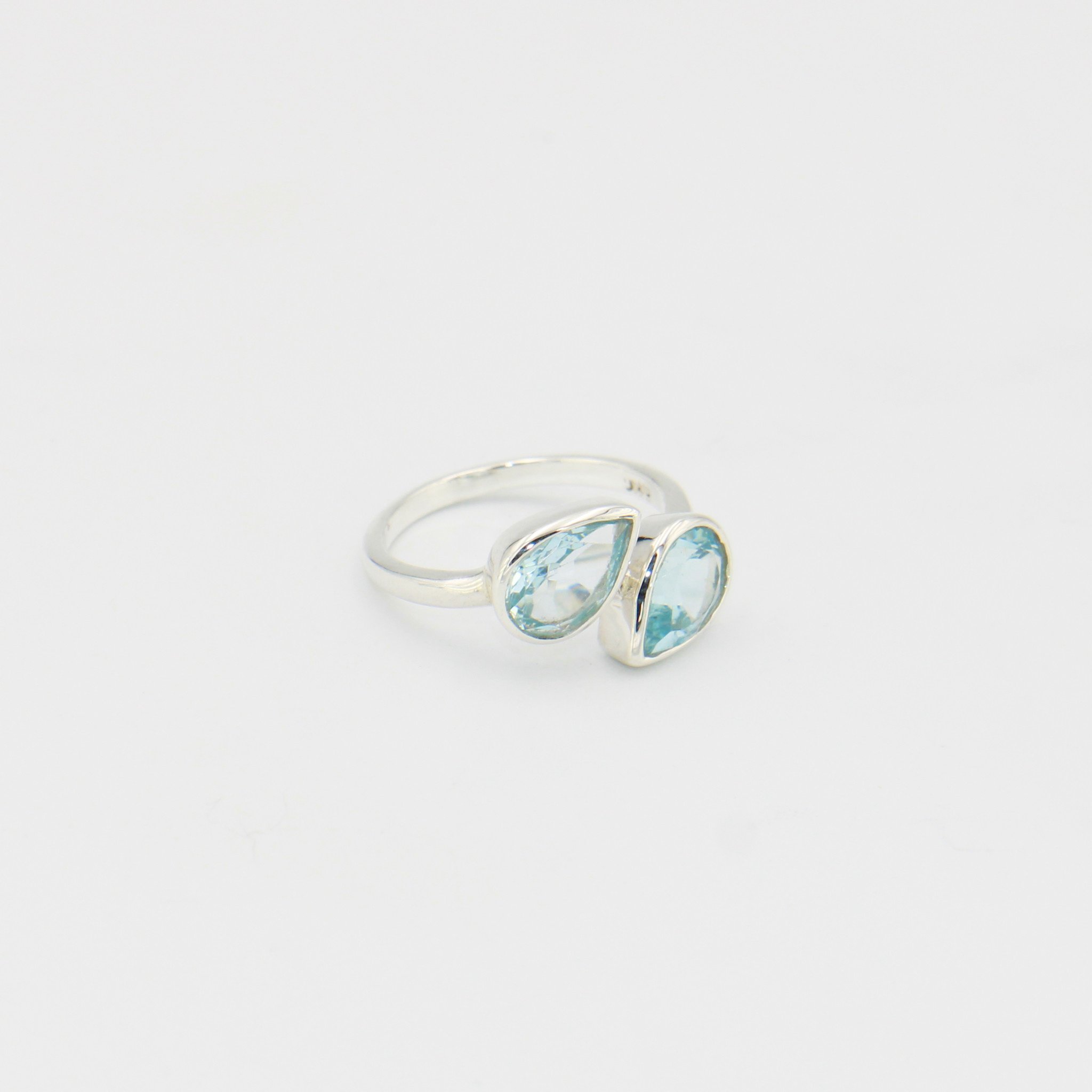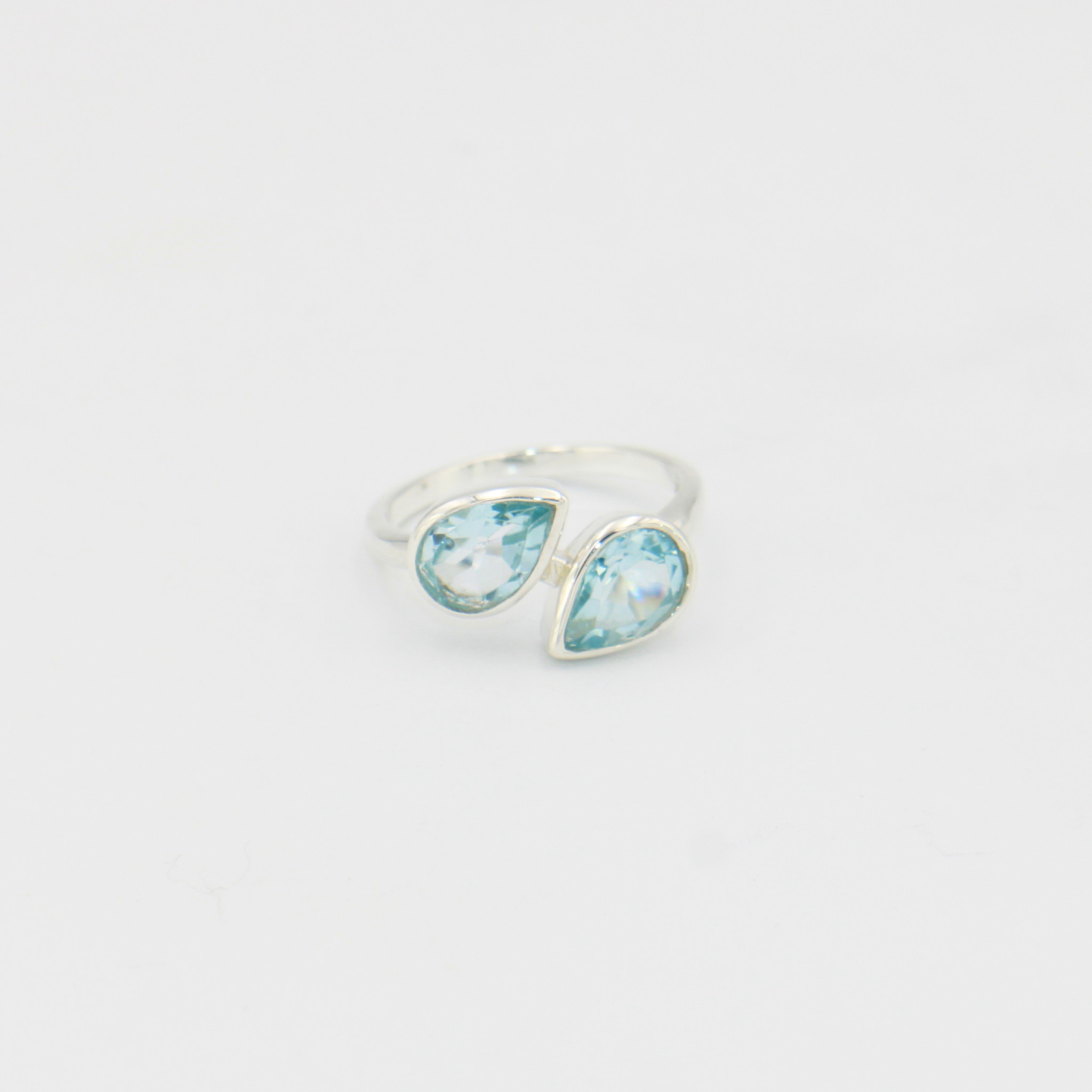 Two sparkling pear cut Blue Topaz stones in an elegant design. Hand made in sterling silver. Size 7