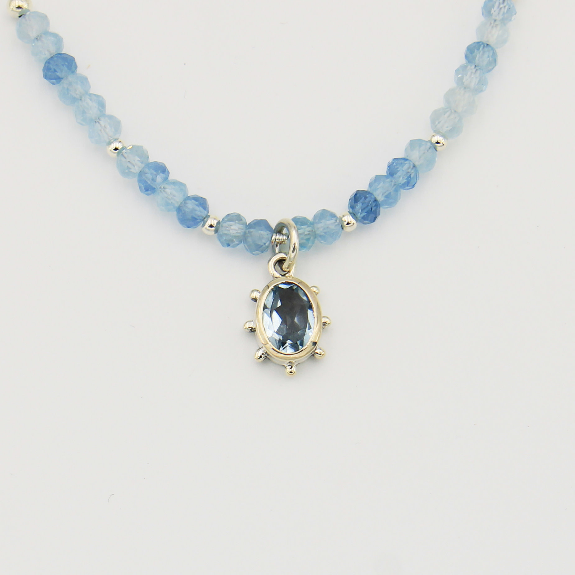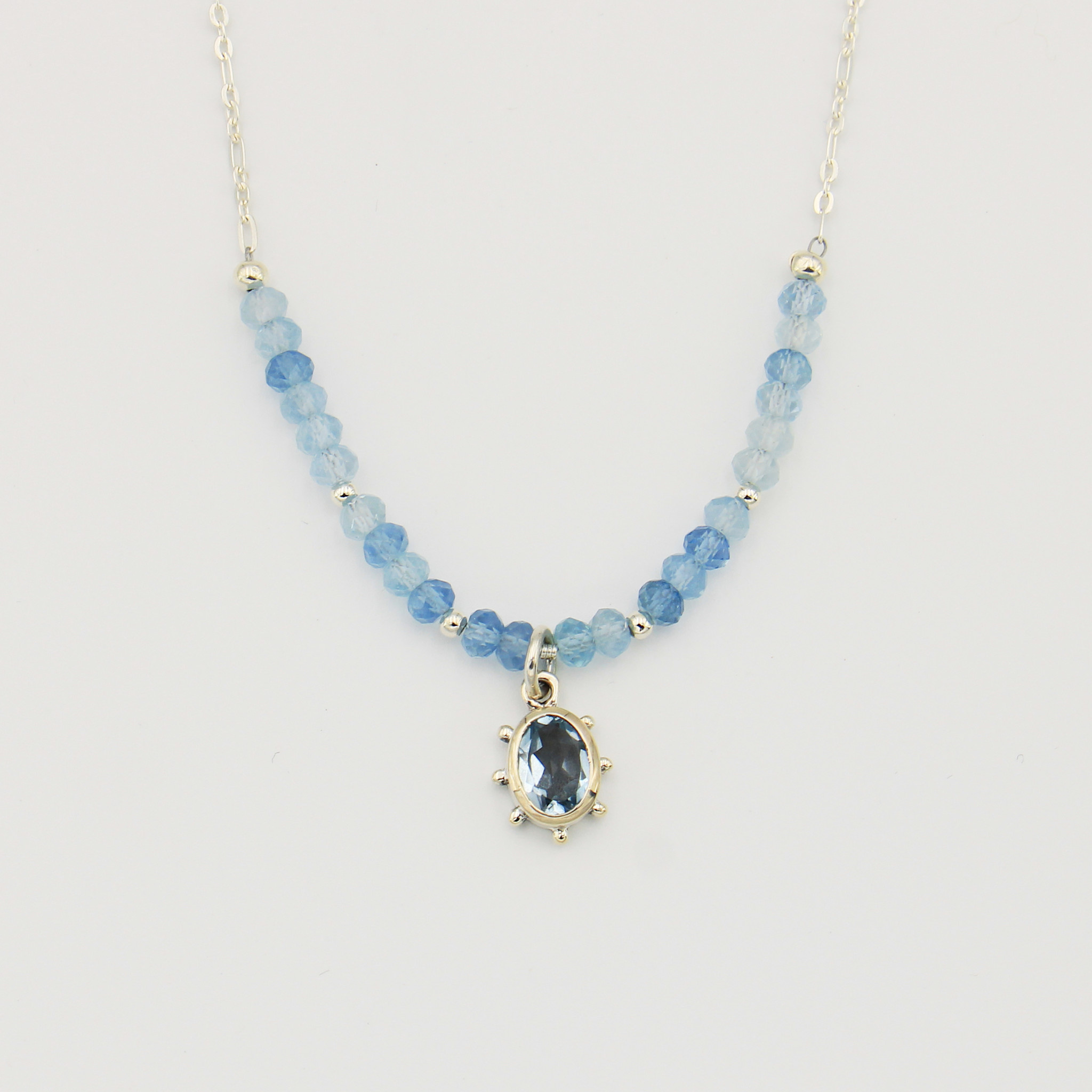 This unique necklace is adjustable and features a small Blue Topaz charm on dainty Aquamarine beads. Sterling silver, hand made.