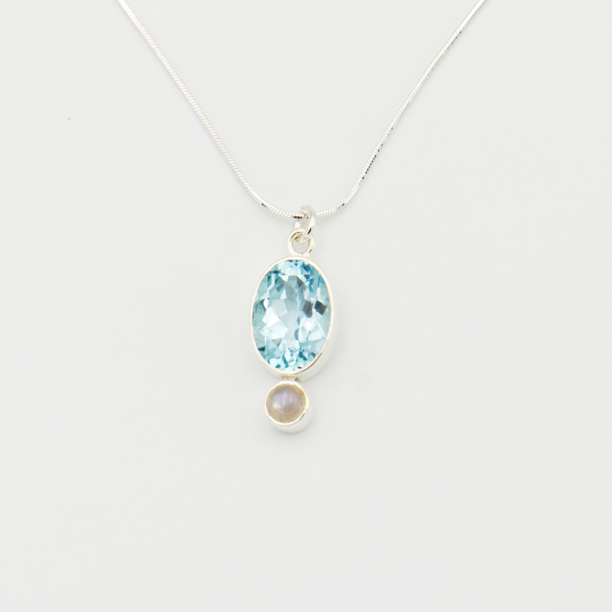 Blue Topaz and Moonstone are such a natural pairing. The ethereal nature of moonstone complimented by sparkling sky blue Topaz.