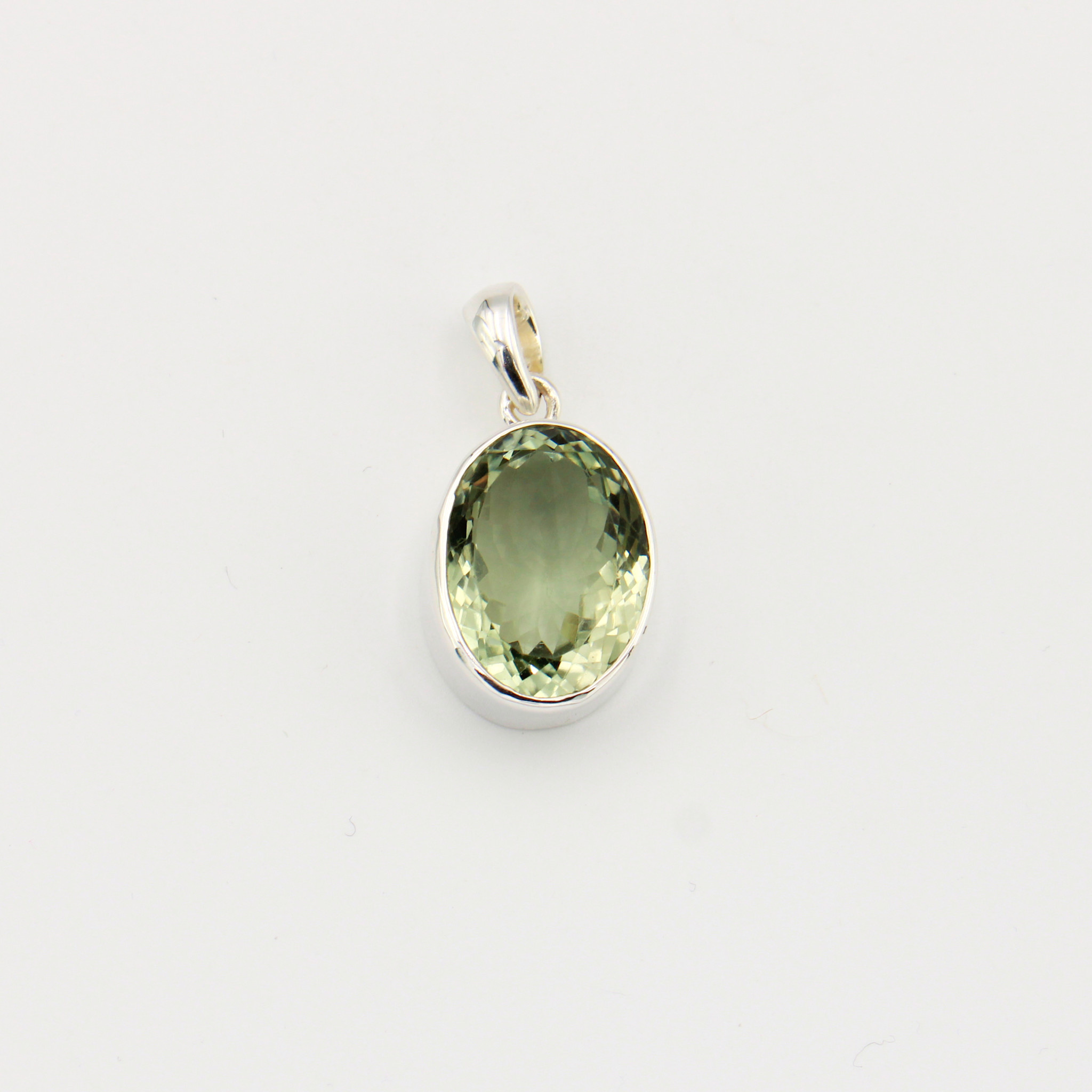 A veritable showstopper! This hand made Green Amethyst pendant is set in sterling silver. The oval cut stone sparkles and glitters with movement. Large stone is approximately 21mm long