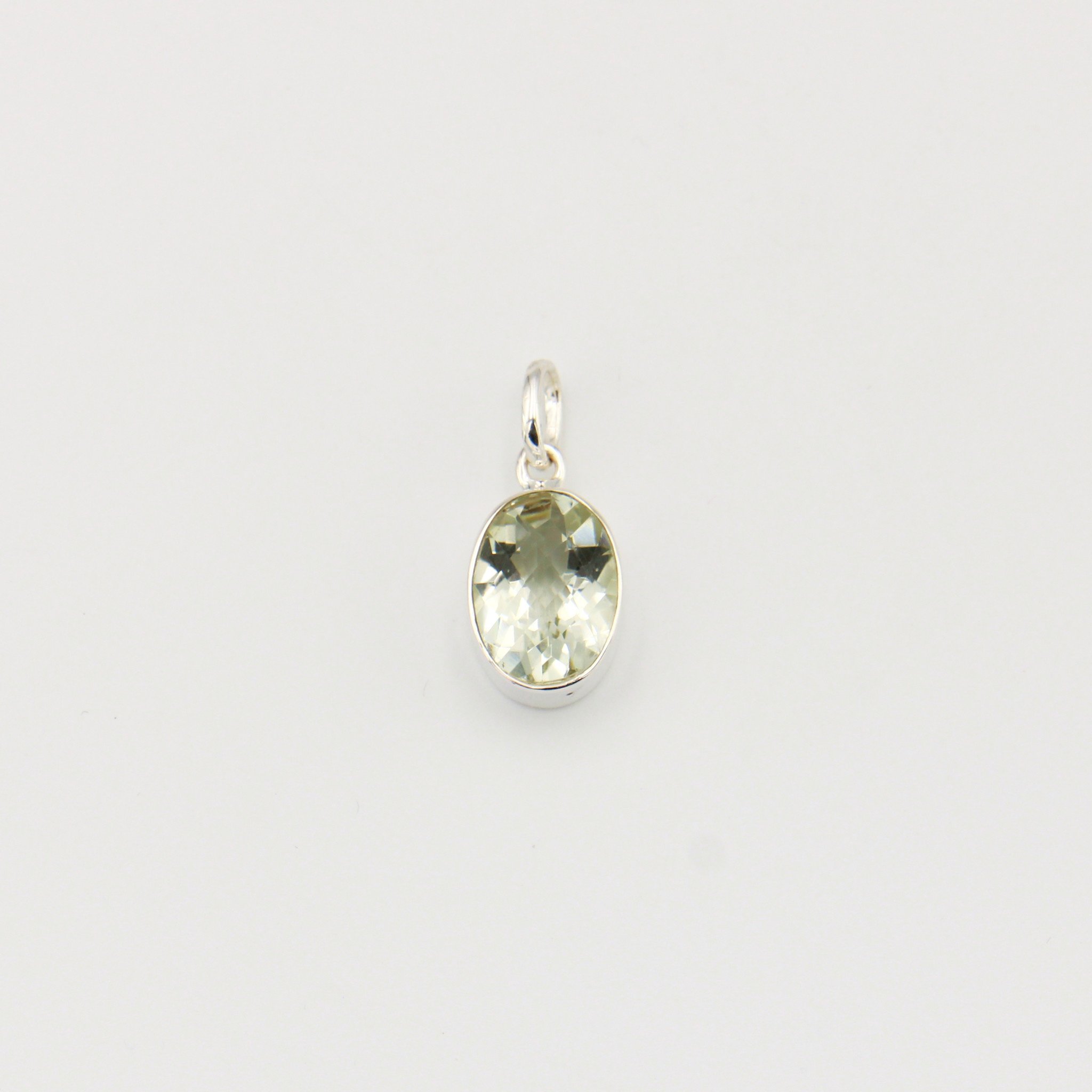 Green Amethyst (A type of quartz) is a brilliant alternative to purple Amethyst for those who want more subtle color, and amazing sparkle. Hand made pendant in sterling silver. Stone is approximately 15mm long and pineapple cut