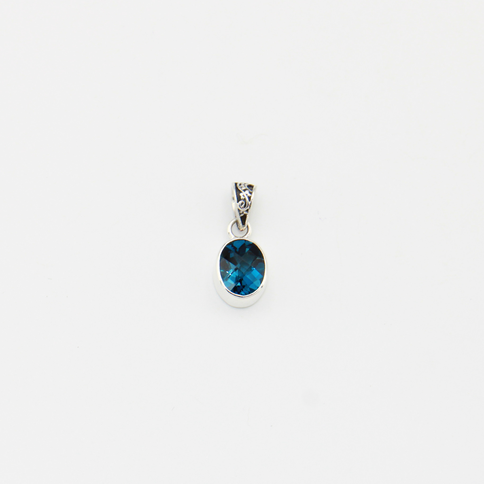 This small London Blue Topaz is the most beautiful rich blue with sparkling facets. Hand made in sterling silver with a oxidized filigree bale
