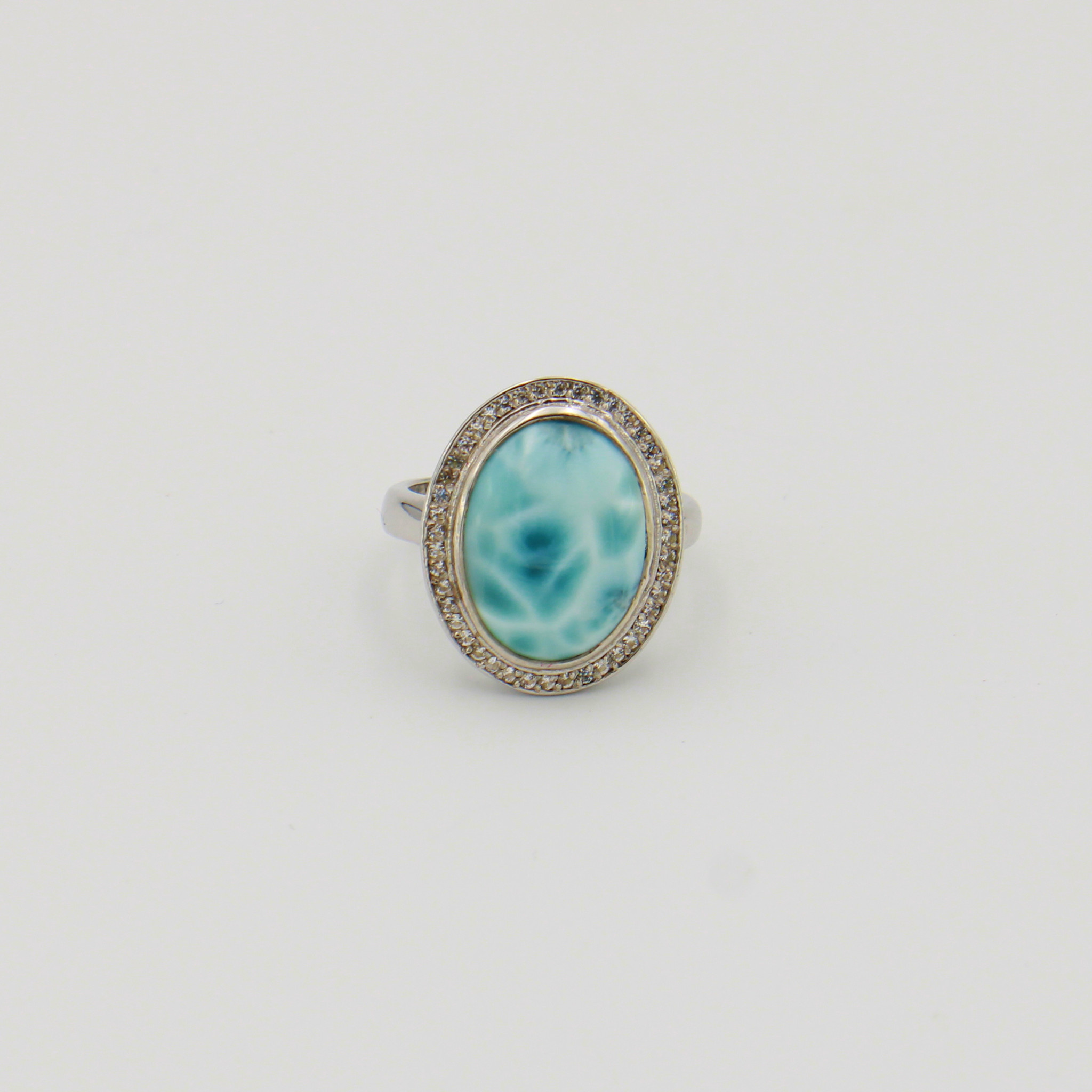 This stunning Larimar ring is accented with sparkling White Sapphires. Simply gorgeous stone on this ring. Sterling silver, size 7.