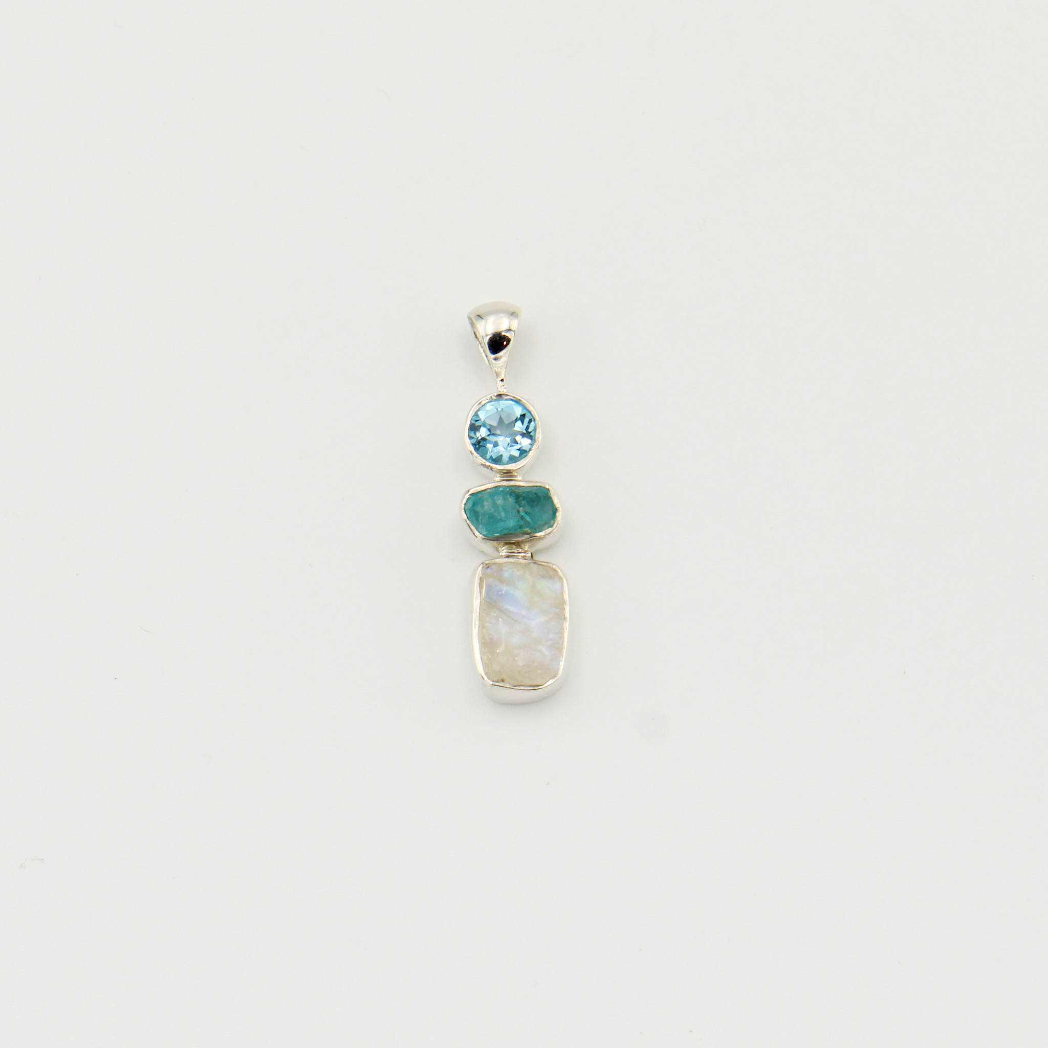 Raw Apatite and Moonstone paired with a faceted, sparkling Blue Topaz, all set in sterling silver.