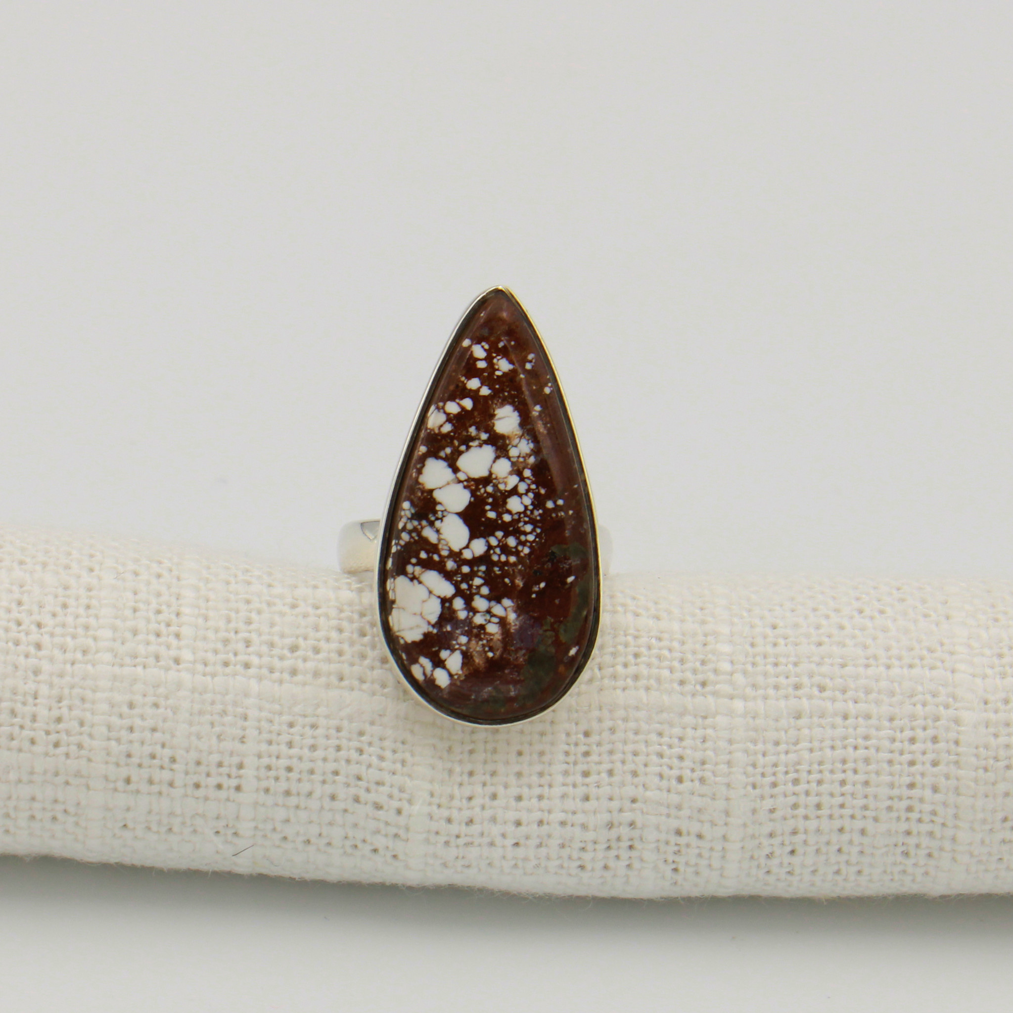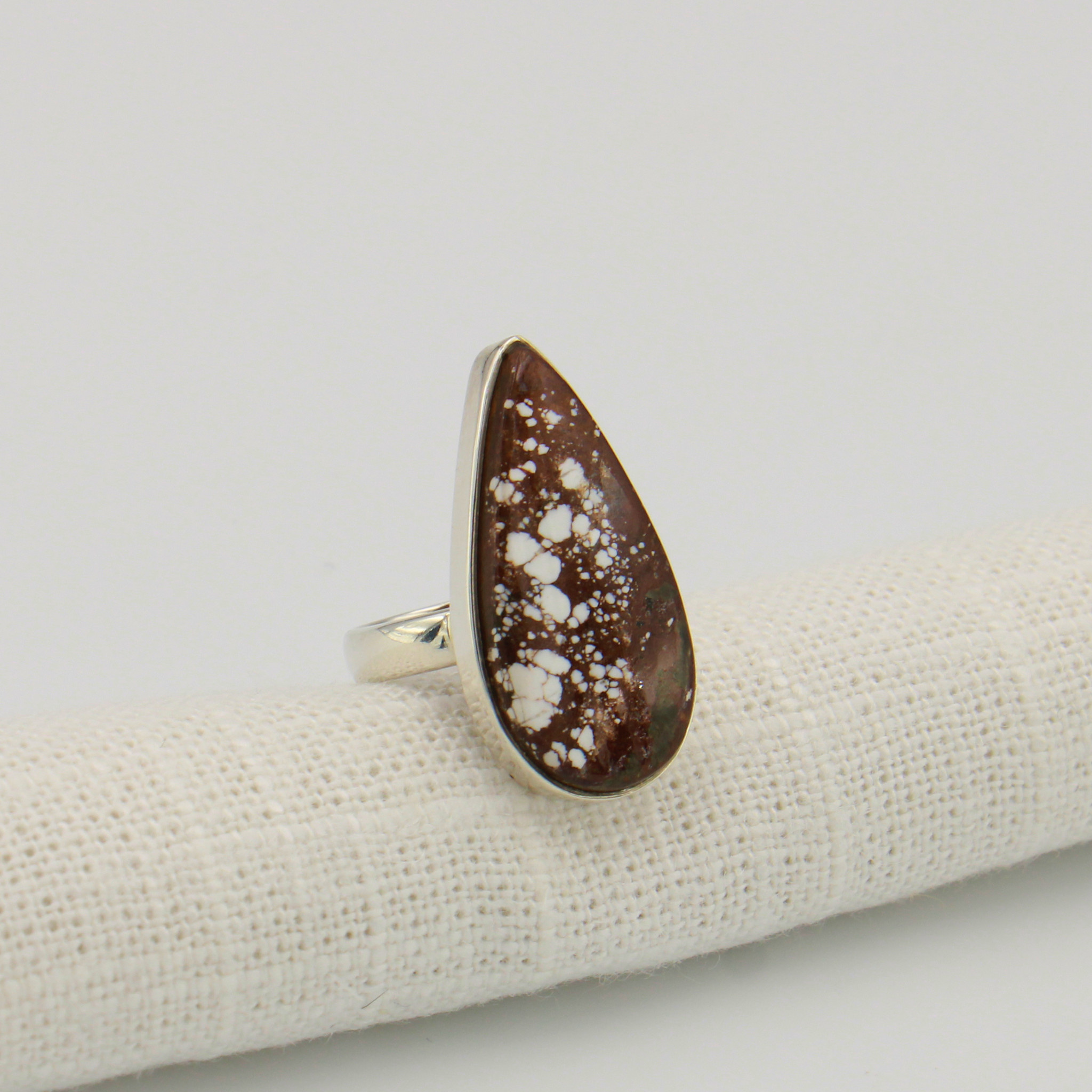 Wild Horse (sometimes called Wild Horse Turquoise) is a lovely stone that works wonderfully in all seasons. This statement ring is flattering on the hand, and ethically made. Recycled sterling silver tested to be free of nickel and other harmful metals. Size 7