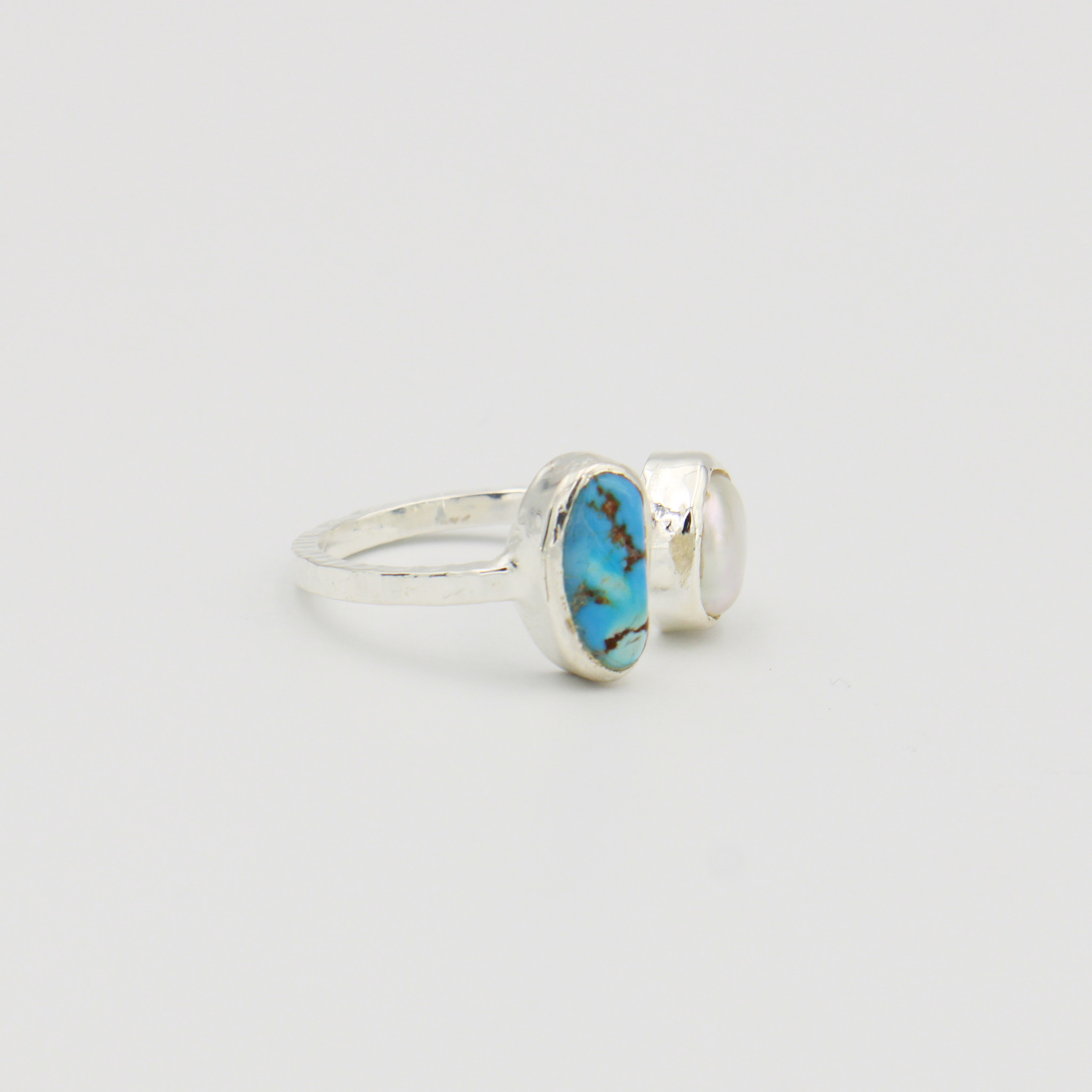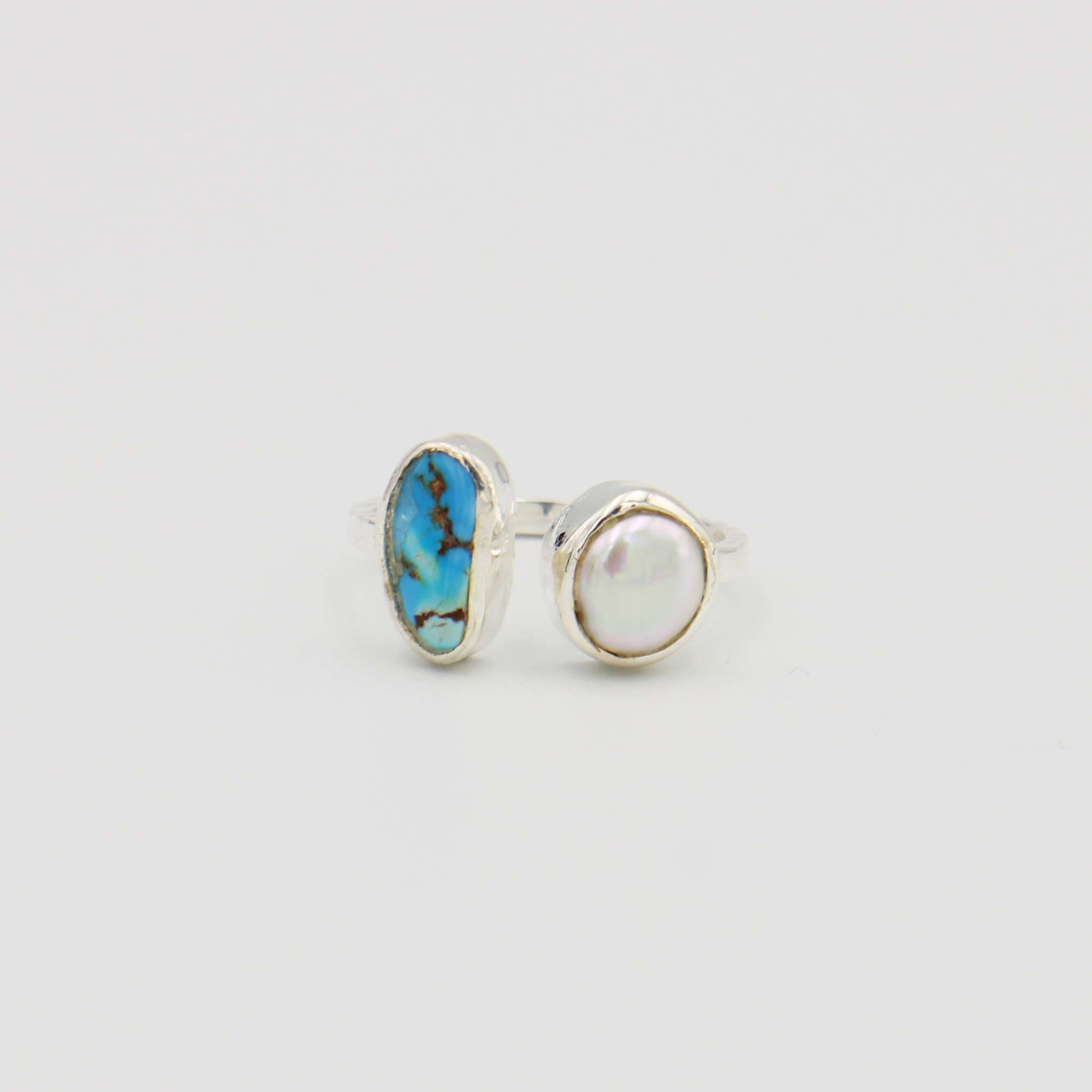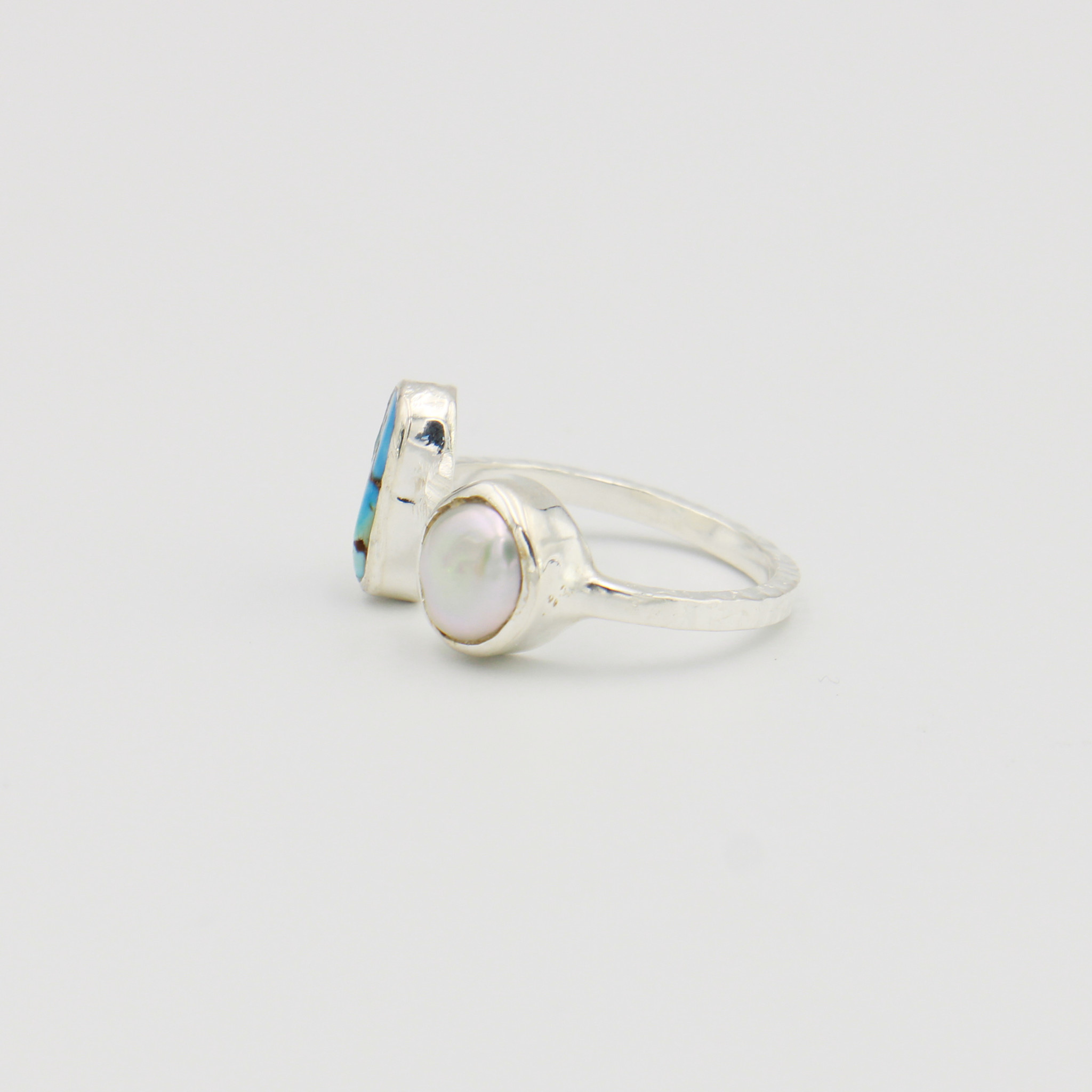 This beautiful sterling silver ring features an unlikely pairing that creates magic together! Turquoise and Freshwater Pearl, size 8.75