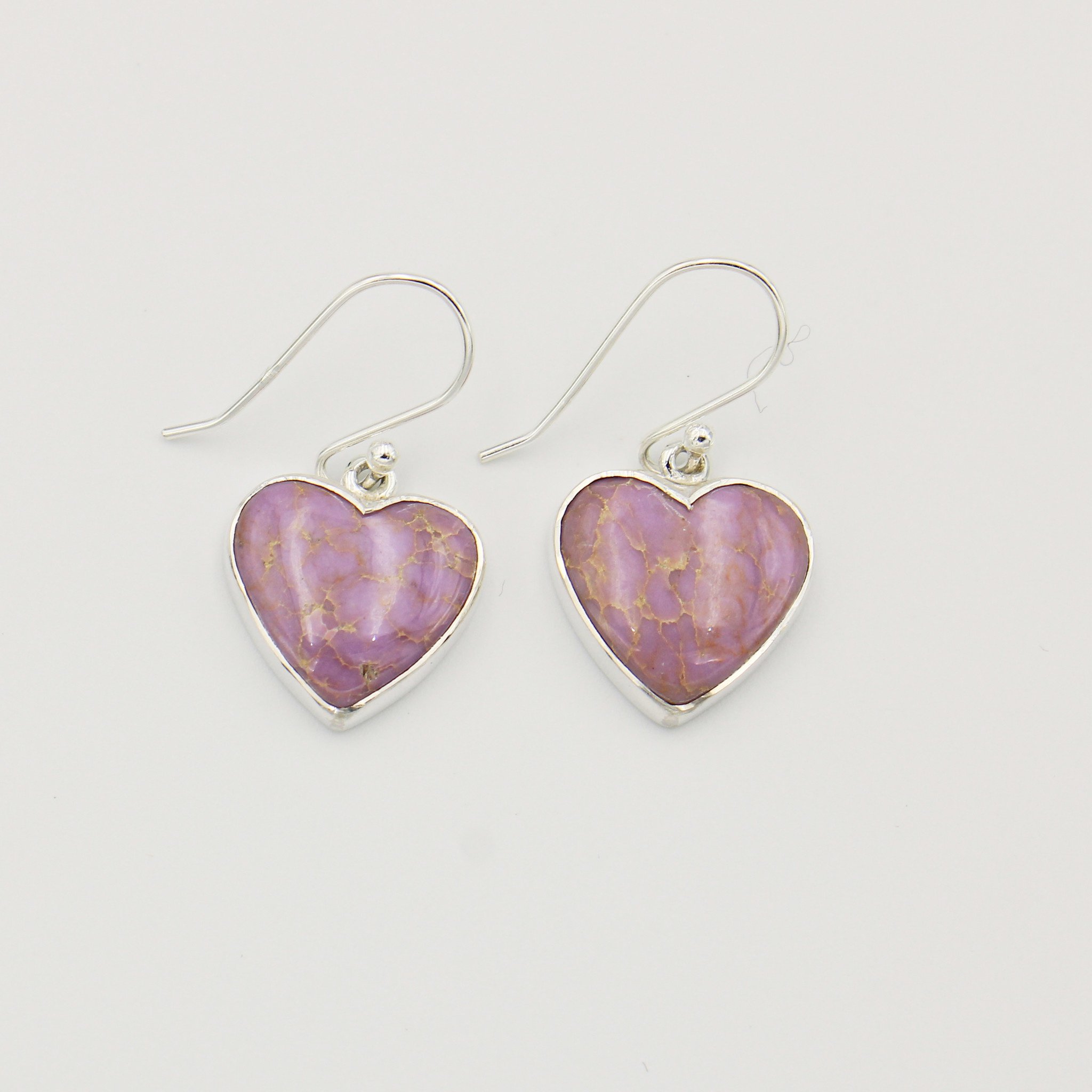 Phosphosiderite's unique pink coloration with ochre veining is eye-catching and pretty. Wearing these sterling silver heart earrings might just make your day!