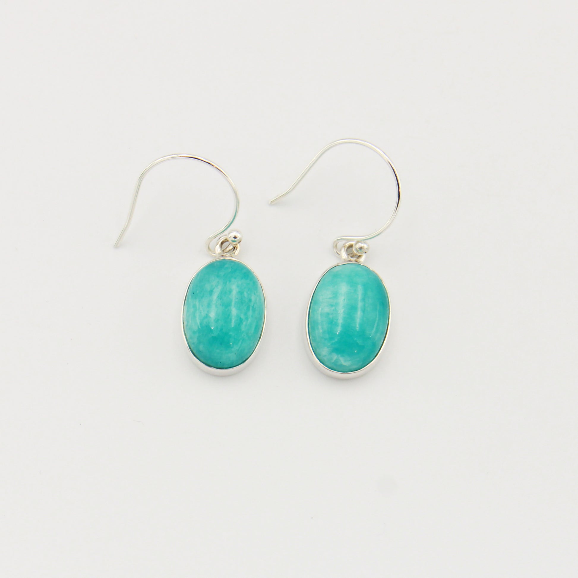 Striking oval amazonite stones set in a sterling silver bezel showcase the stone's serene turquoise hues. These earrings combine timeless elegance with the natural beauty of genuine gemstones, perfect for adding a sophisticated touch to any collection.