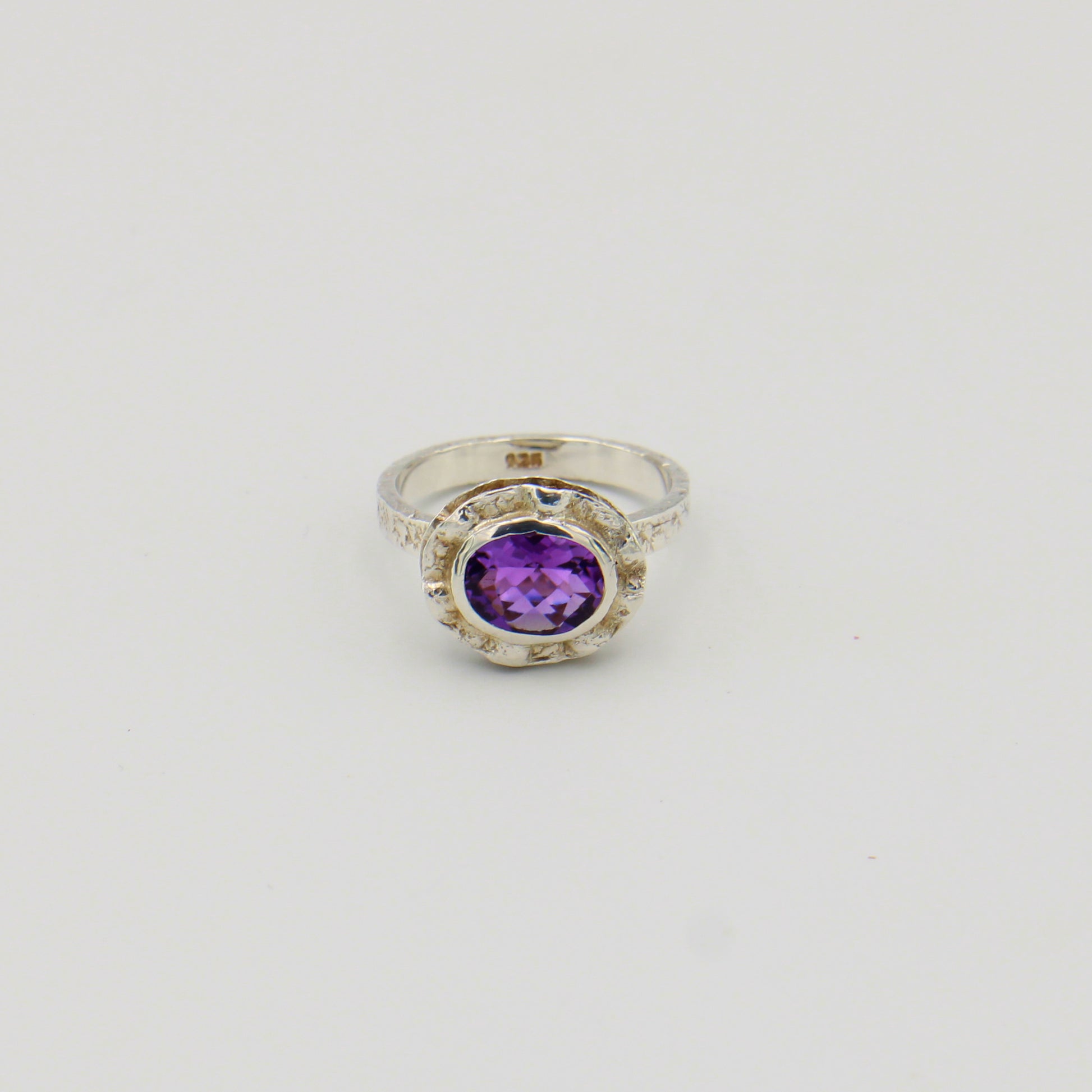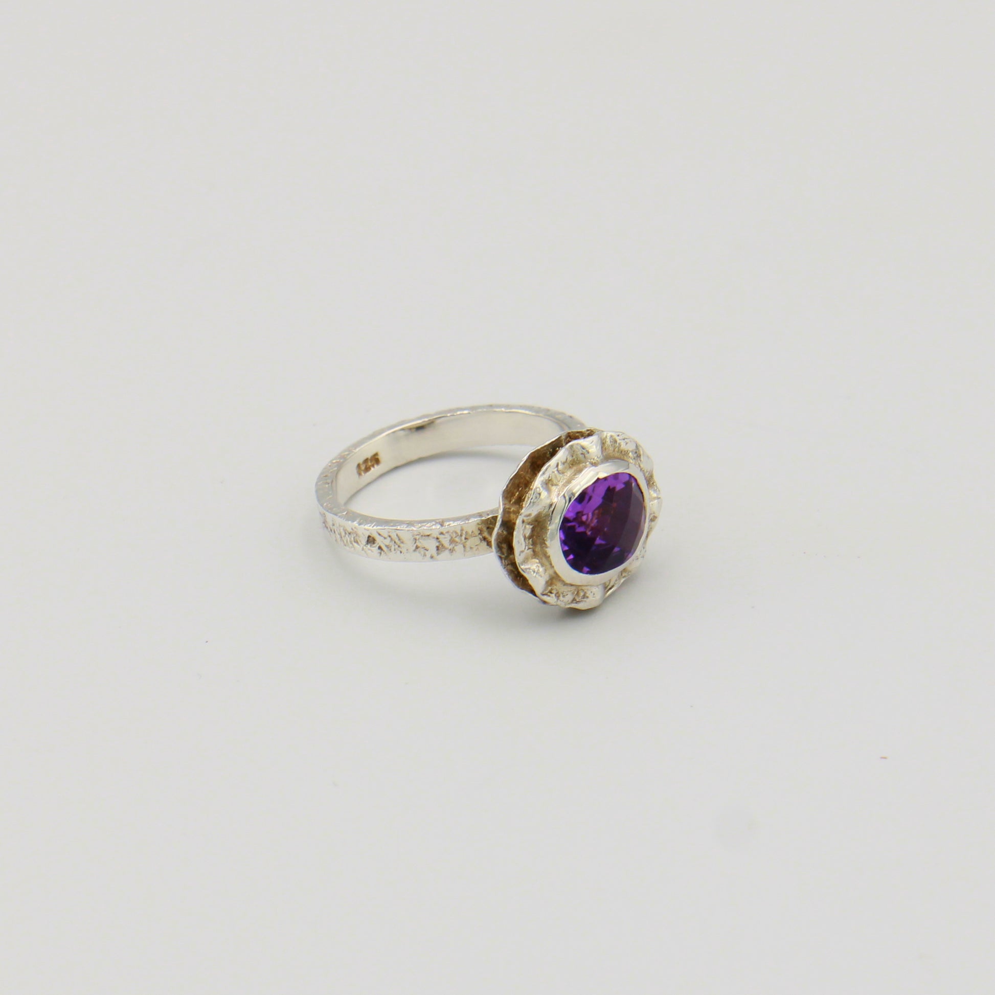 Amethyst set in a raw, organic bezel crafted from sterling silver delivers understated elegance with an artisanal edge. This size 8 ring showcases the stone's natural purple hues while the textured bezel setting emphasizes handcrafted authenticity. The double bezel design adds depth and visual interest, making it a distinctive piece for those who appreciate unconventional metalwork and genuine gemstone character.