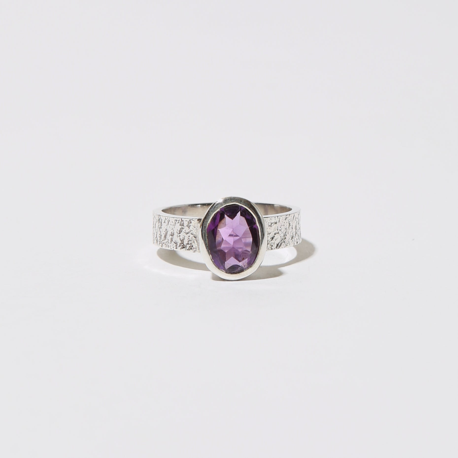 Striking amethyst oval set in sterling silver with a refined textured finish. This size 6 ring showcases the stone's natural purple hues while the hammered band adds sophisticated dimension. A versatile piece that transitions seamlessly from everyday wear to special occasions.
