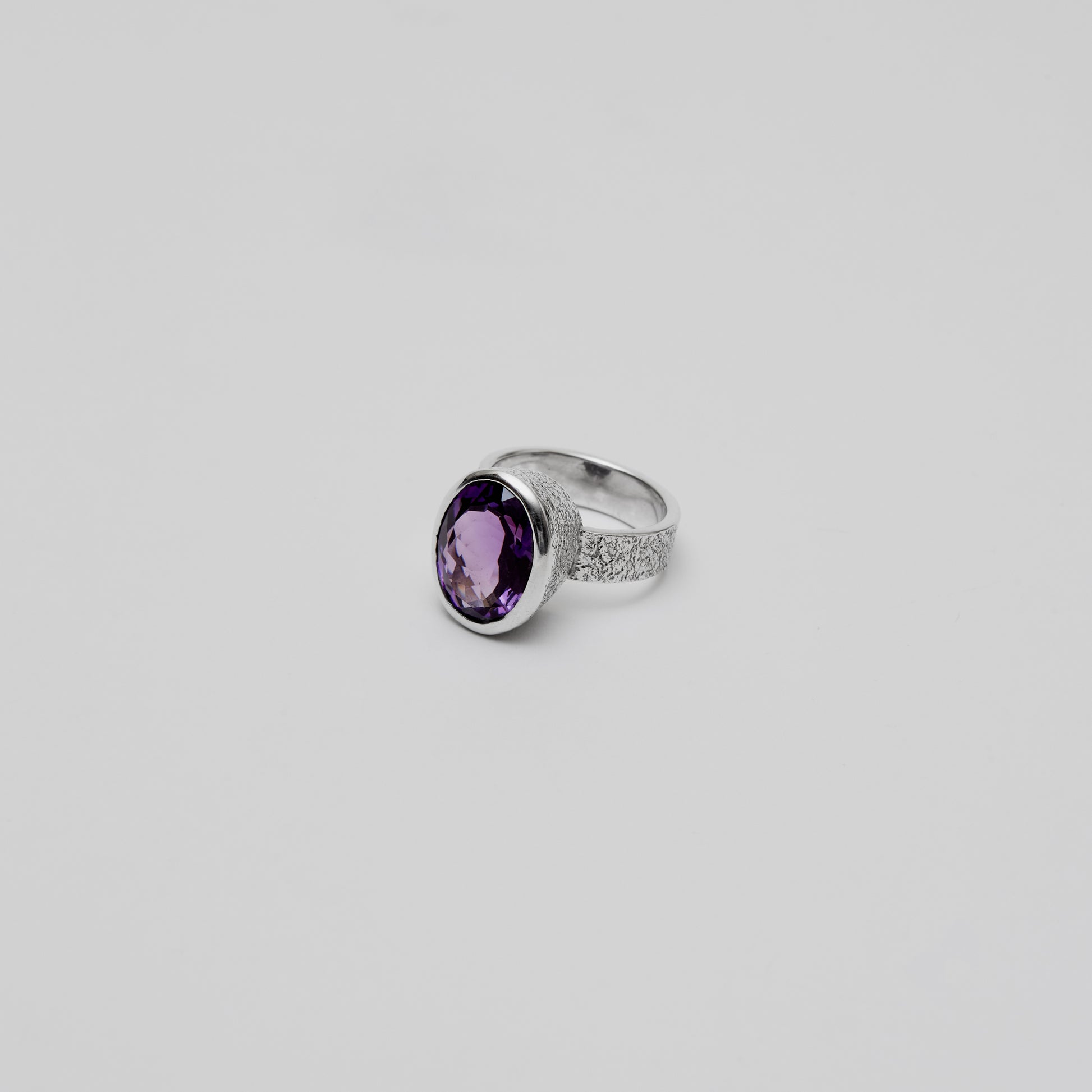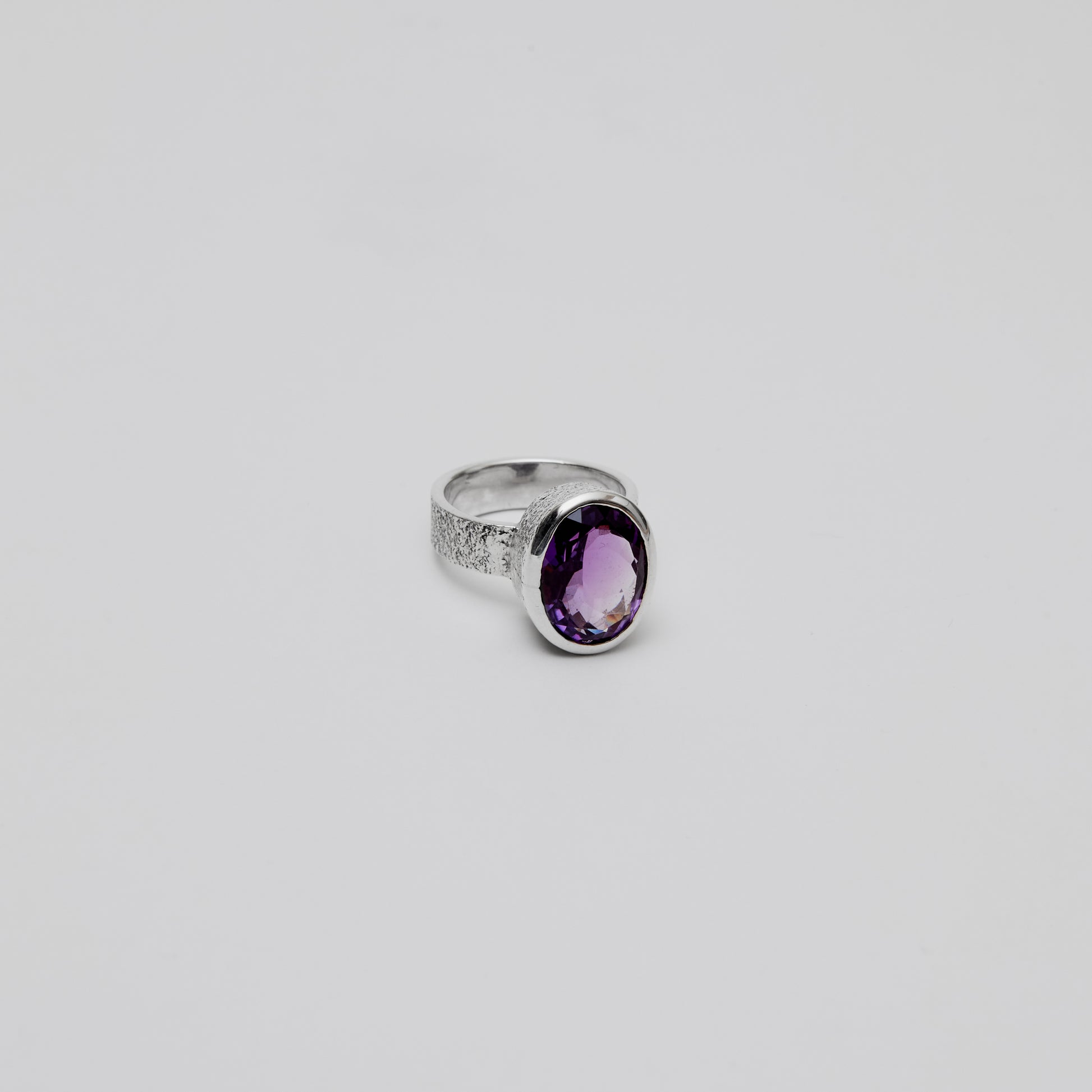 Oval amethyst stone set in a sterling silver bezel with a textured band. The crafted surface detail adds visual interest while the secure setting showcases the stone's natural purple hue. A refined piece for everyday wear or special occasions.