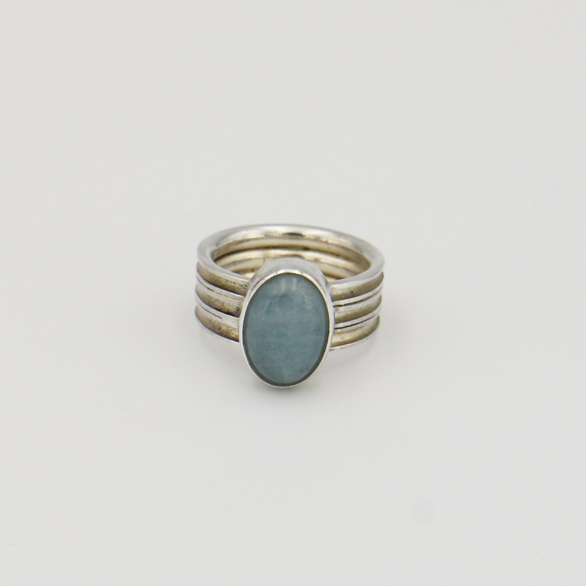 Aquamarine oval stone set in a sterling silver band featuring distinctive striped ridges. The textured design adds visual interest while the thick band provides durability and a substantial feel. Available in size 7.5.