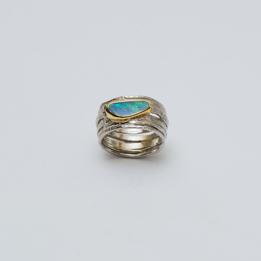 Stunning Australian opal set in a gold-plated bezel with a thick sterling silver band. This wide ring in size 9 showcases the natural play of color that makes opal so captivating. The sterling bands are soldered together to give it a unique stacking look. Perfect for adding a touch of elegance to any occasion.