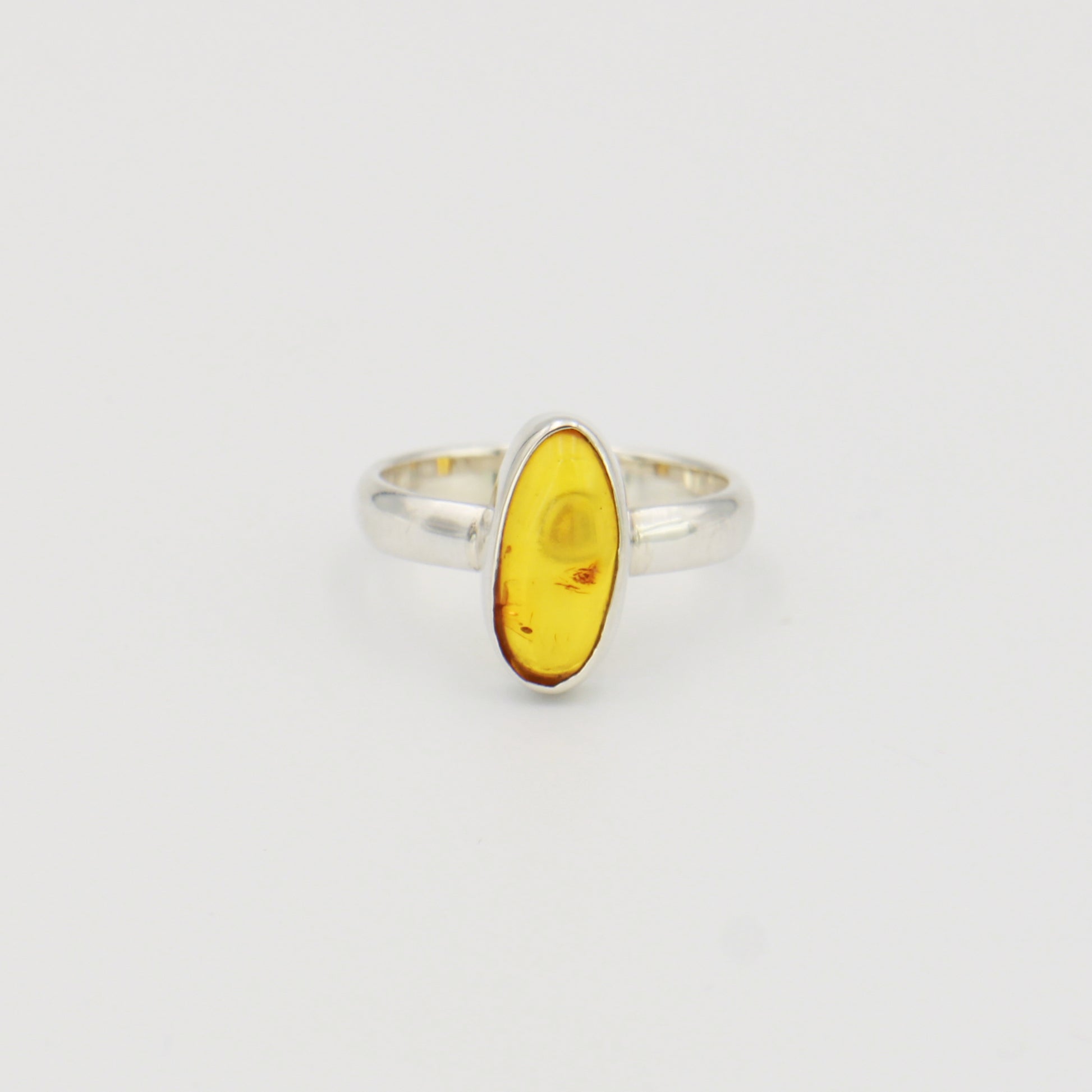 Warm honey-toned Baltic amber set in polished sterling silver. This oval stone catches the light beautifully, making it a versatile piece for everyday wear or special occasions. Size 7. Timeless elegance in a classic design.