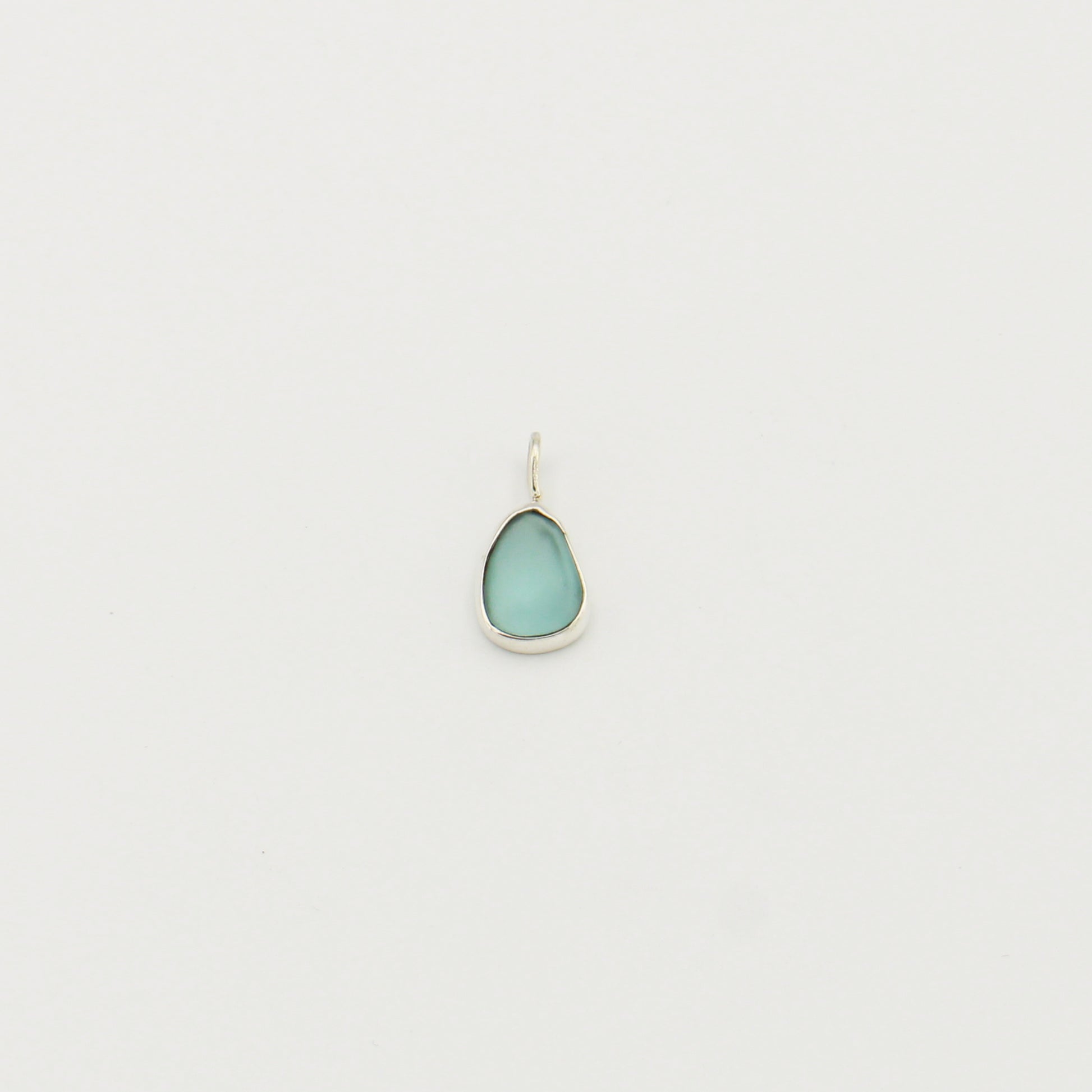 Beach glass pendant in soft ice blue, cut in a delicate pear shape. Crafted from sterling silver for lasting wear. A subtle coastal-inspired piece perfect for everyday elegance.