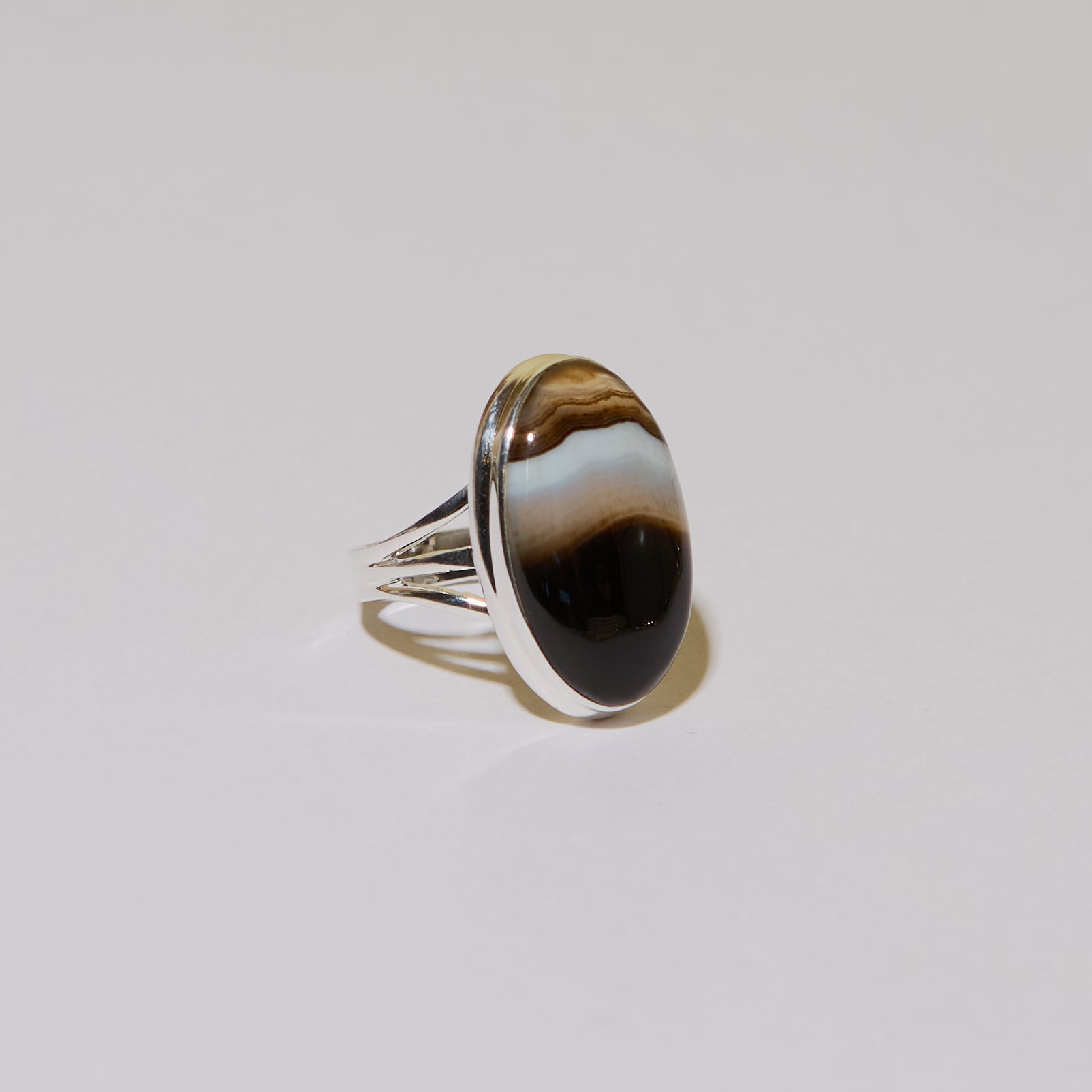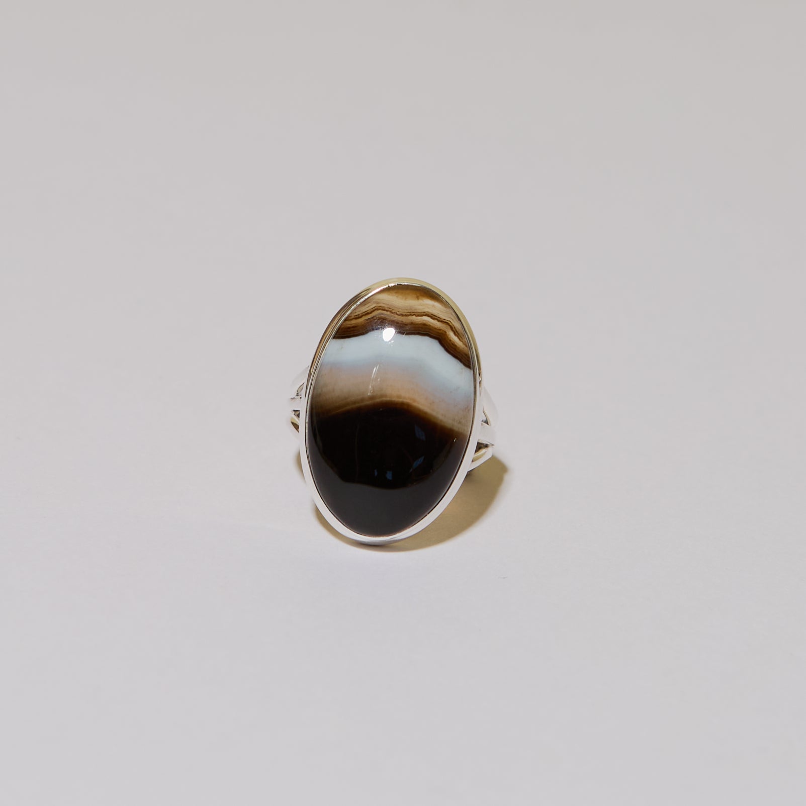 Black Banded Agate Oval Ring in size 9 features a bezel-set stone that showcases the natural striped patterns of agate. The secure bezel setting protects the gemstone while creating a polished, finished look. Perfect for everyday wear or as a distinctive statement piece.