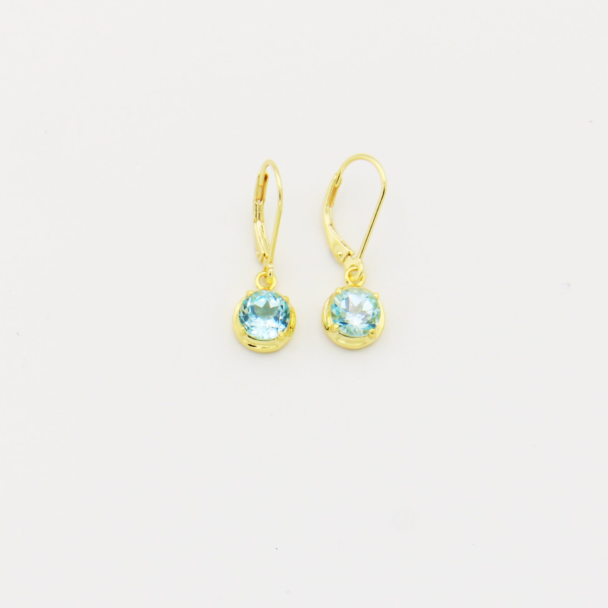 Radiant blue topaz gemstones suspended in a graceful drop design, secured with a classic prong setting that maximizes light and brilliance. Crafted in 18k gold-filled metal for enduring elegance and wear resistance. Lever back closures provide a secure, comfortable fit throughout the day.