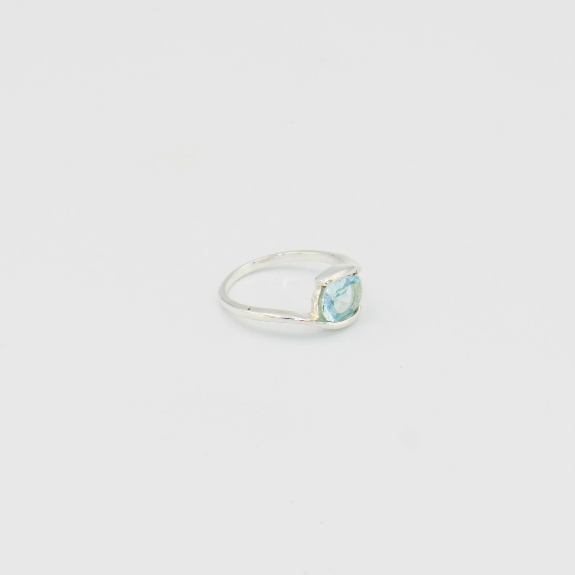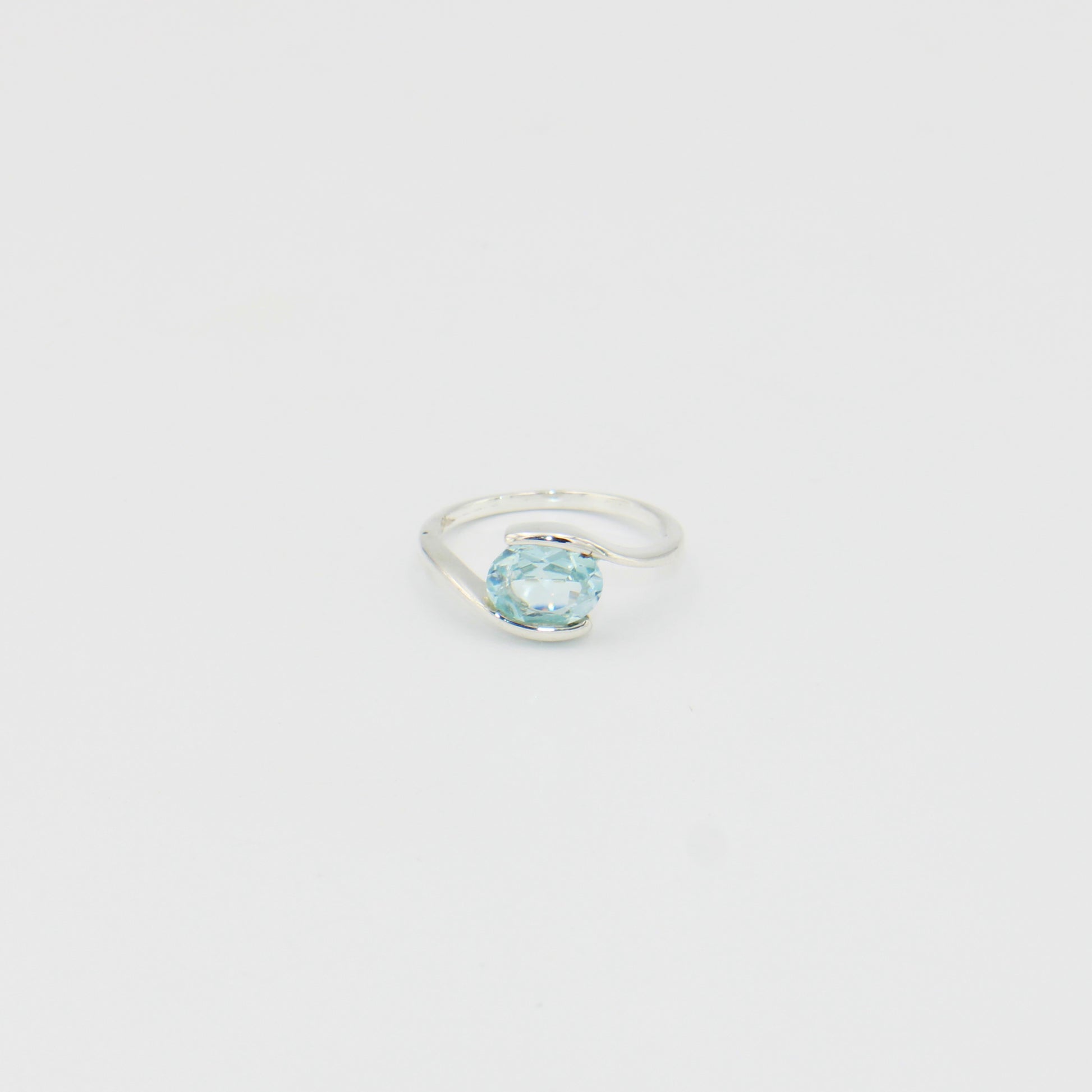 Blue topaz oval stone set in sterling silver with a twisted band that wraps around the stone. Classic bypass design in size 8.