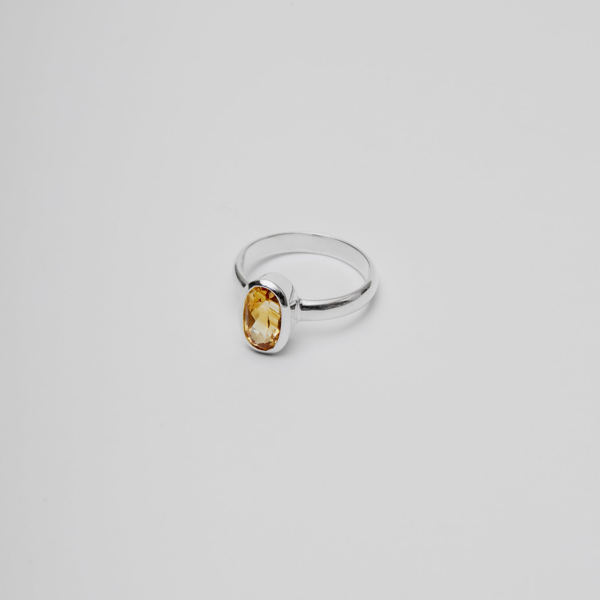 Citrine oval stone set in a protective bezel setting with sterling silver band. Classic design that showcases the warm golden hue of the gemstone. Ring size 8.5.