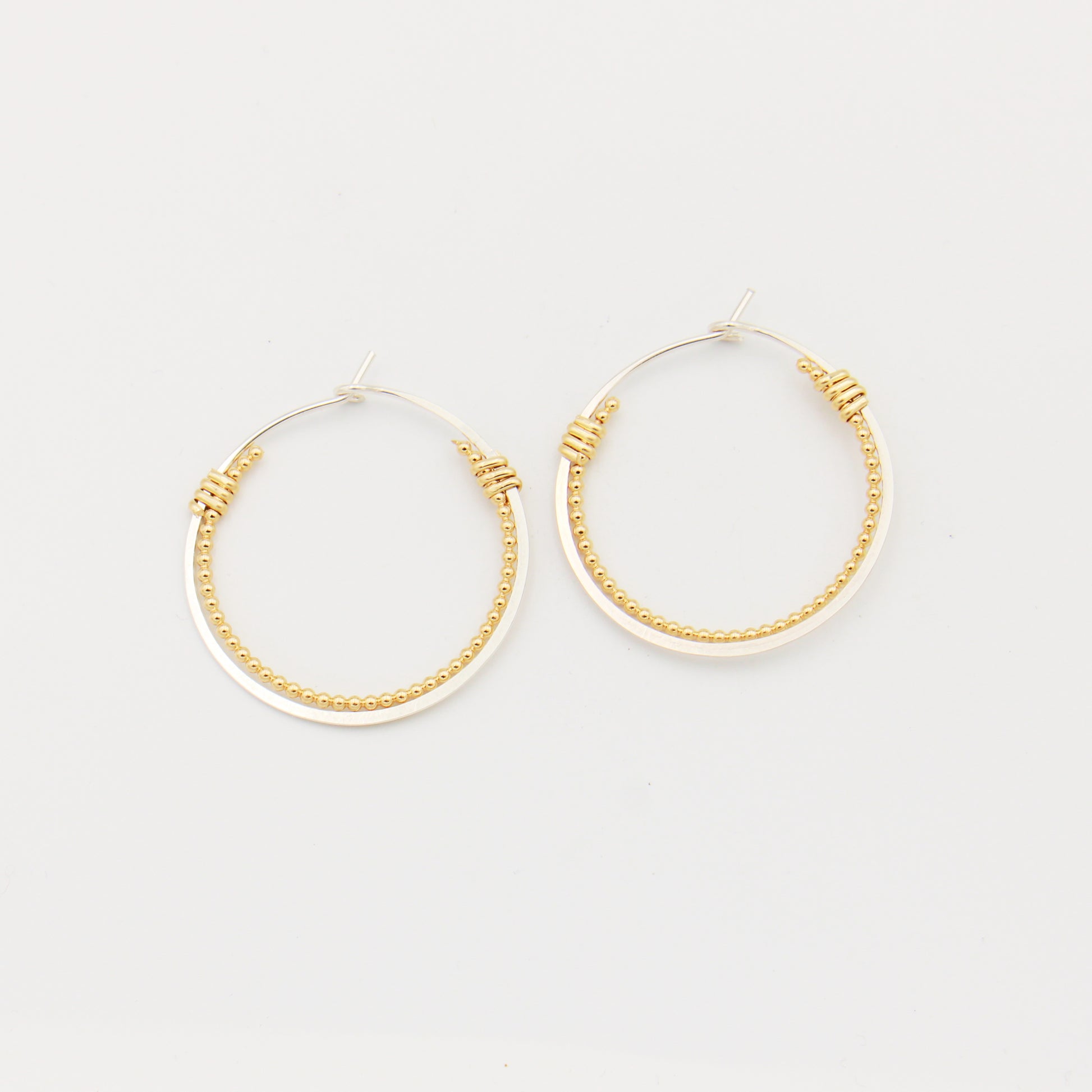 These gorgeous hoops will make a statement and work with many styles. Gold fill and sterling silver complement and create a cohesive look of mixed color and texture. 1.25 inch diameter. Handmade in the U.S.