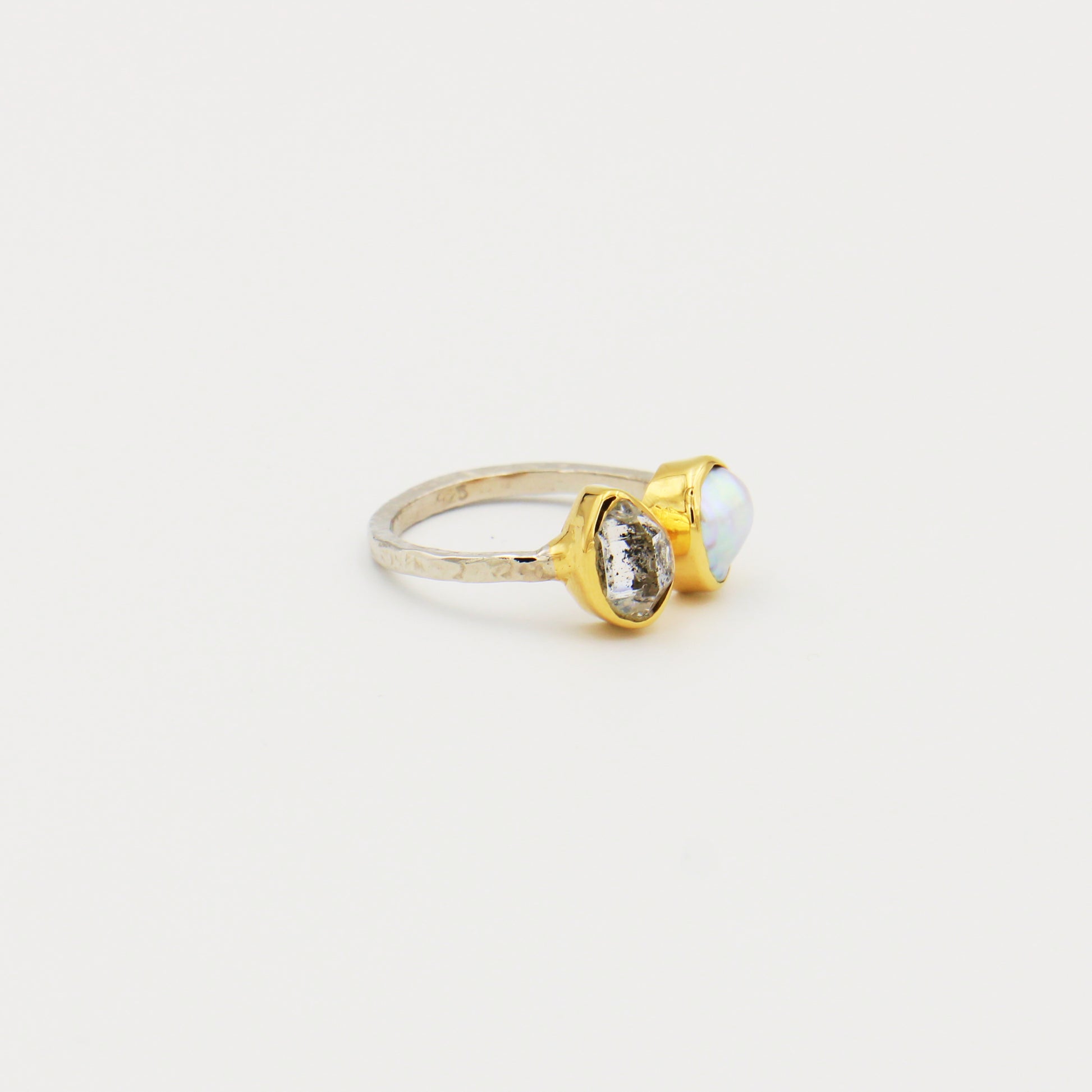 A herkimer diamond is paired with a freshwater pearl in this gold plated sterling silver ring. The gold plated bezels sit on top of the hammered sterling band. Size 9.