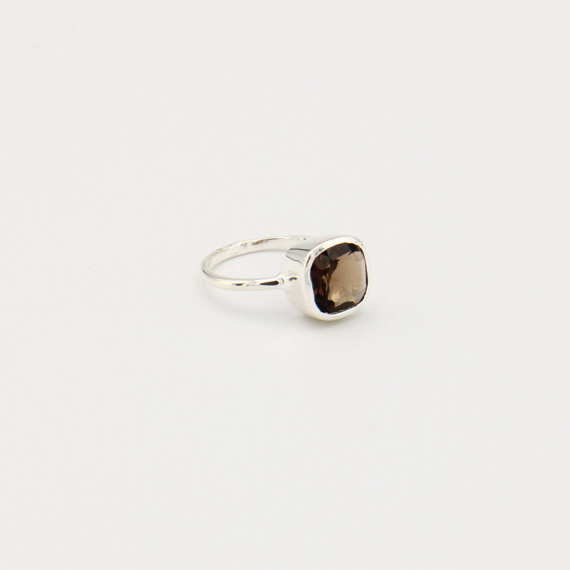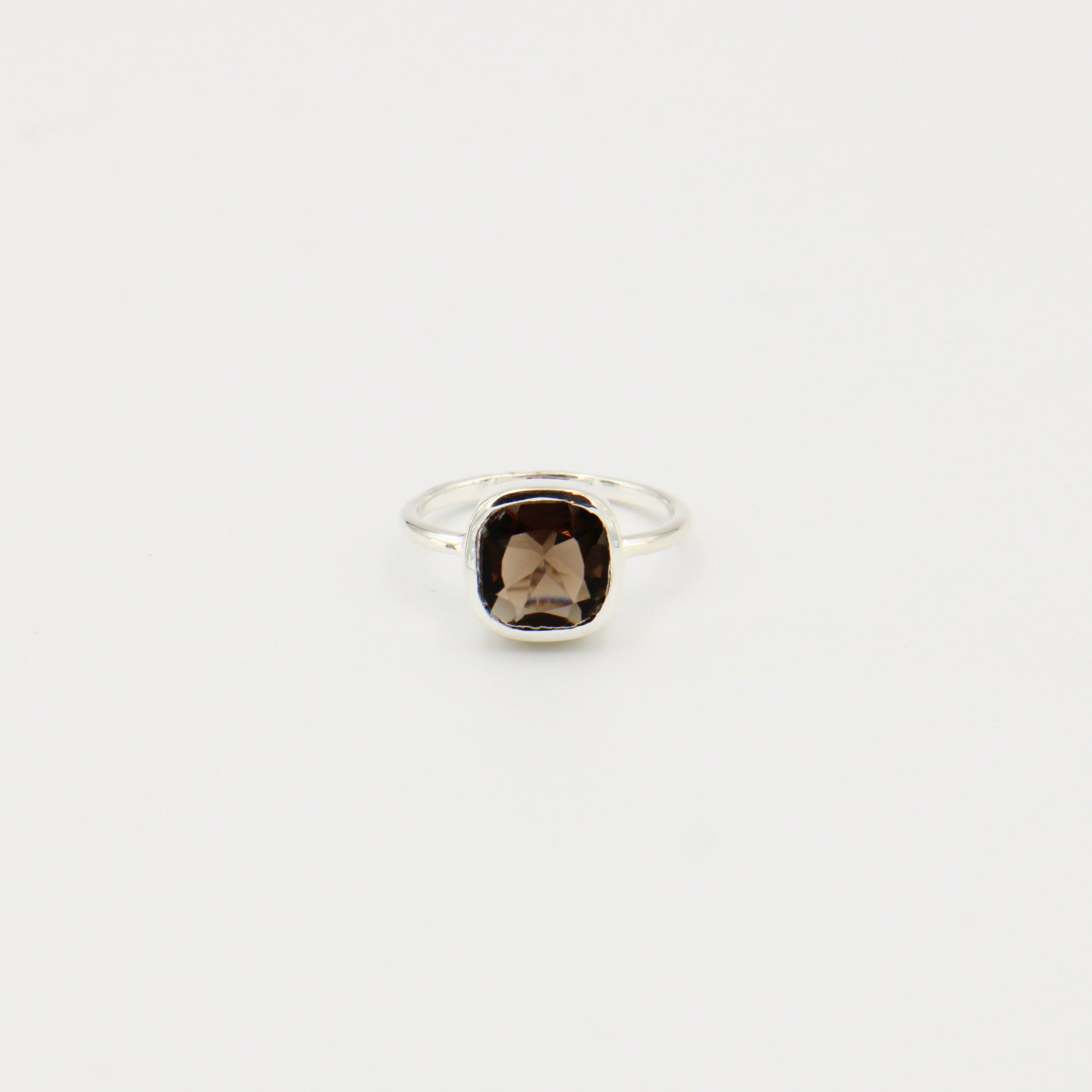 Sterling silver ring featuring a cushion cut smokey quartz stone. Size 7. The rich, smoky brown hue adds warmth and sophistication to any collection.
