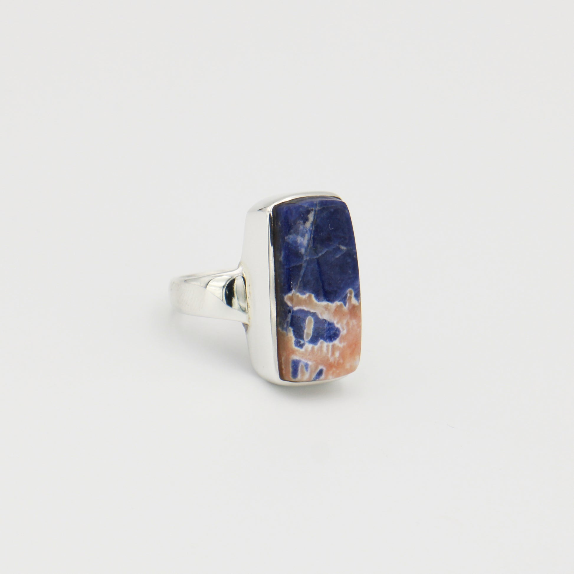 Deep blue sodalite rectangle stone secured in a sterling silver band. Size 7.5. This timeless ring combines natural gemstone beauty with precious metal craftsmanship, ideal for those seeking understated elegance.