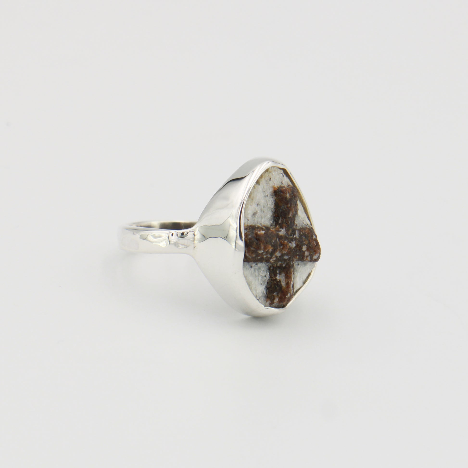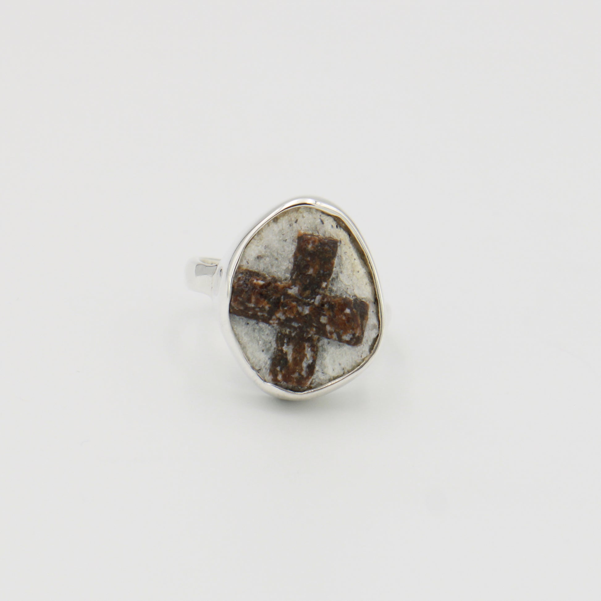 Natural staurolite stone set in sterling silver, sized 10. This ring combines the beauty of a genuine gemstone with outstanding silver craftsmanship. Perfect for those seeking a distinctive piece and a unique stone.