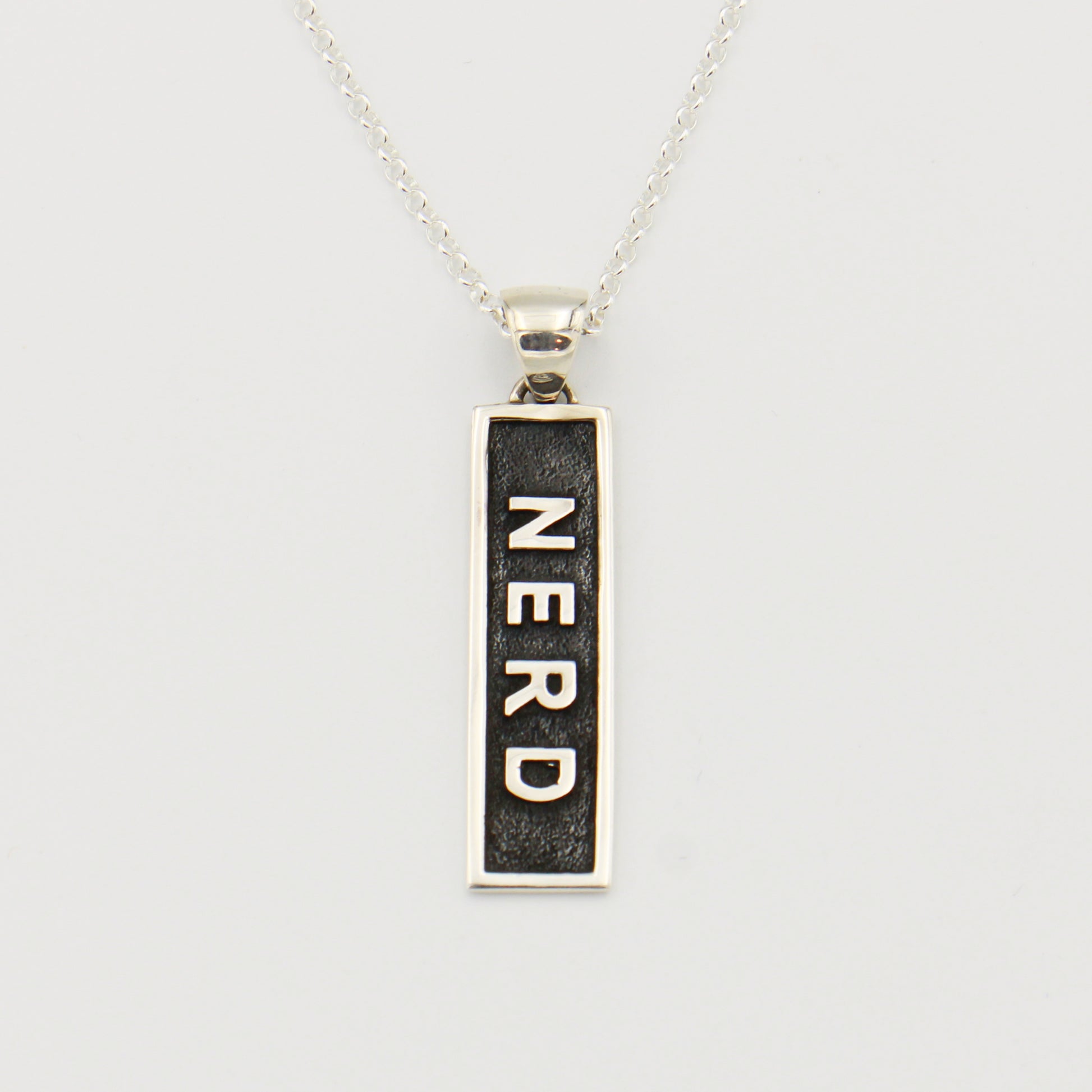 Sterling silver necklace featuring a playful "nerd" design. Perfect for celebrating your love of books, science, and all things geeky. A fun statement piece for anyone who embraces their nerdy side.