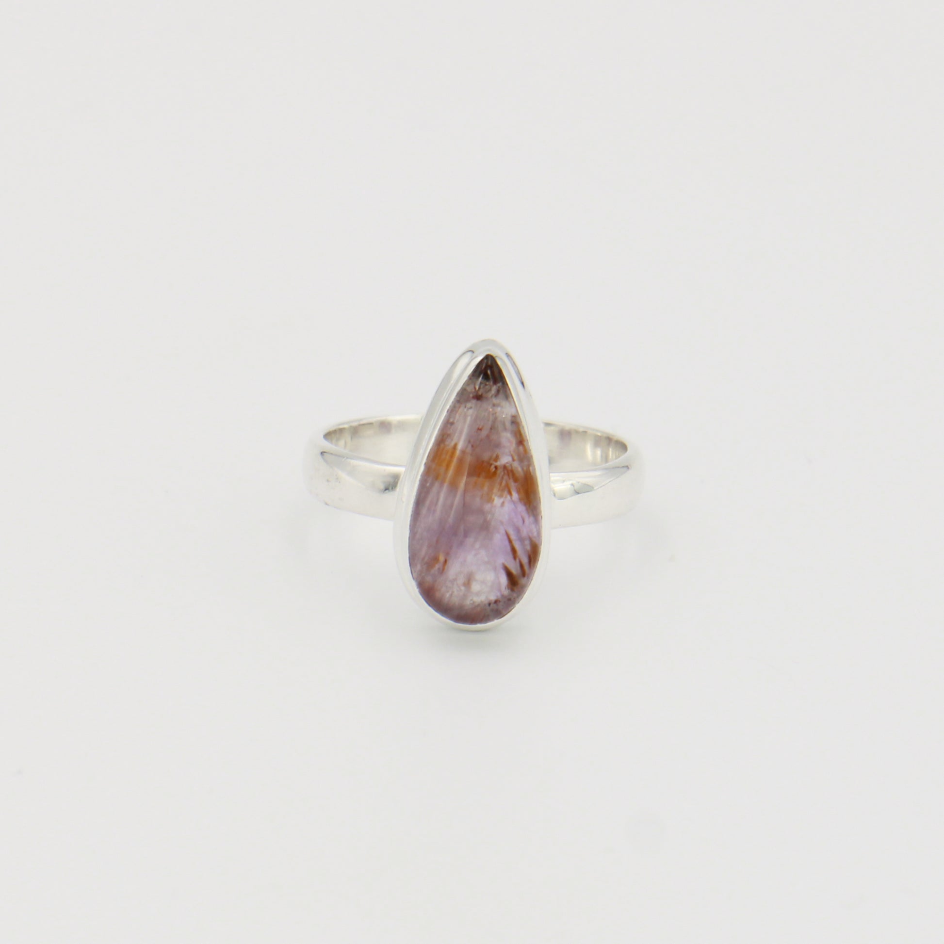 Super Seven teardrop ring crafted in sterling silver, sized 9. This natural gemstone features a blend of amethyst, clear quartz, smoky quartz, lepidolite, goethite, and cacoxenite, creating a unique multicolored stone. The teardrop cut showcases the stone's natural beauty and color variations. Perfect for everyday wear or as a meaningful gift.