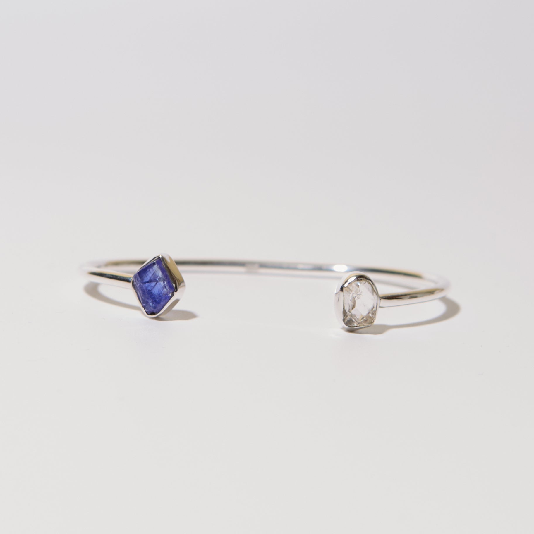 Tanzanite and Herkimer Diamond sit opposite of each other on this sterling silver cuff, creating a balanced design that pairs deep blue-violet tones with sparkling clarity. The contrasting stones offer visual interest while the sterling silver band provides a polished, wearable foundation for everyday elegance.
