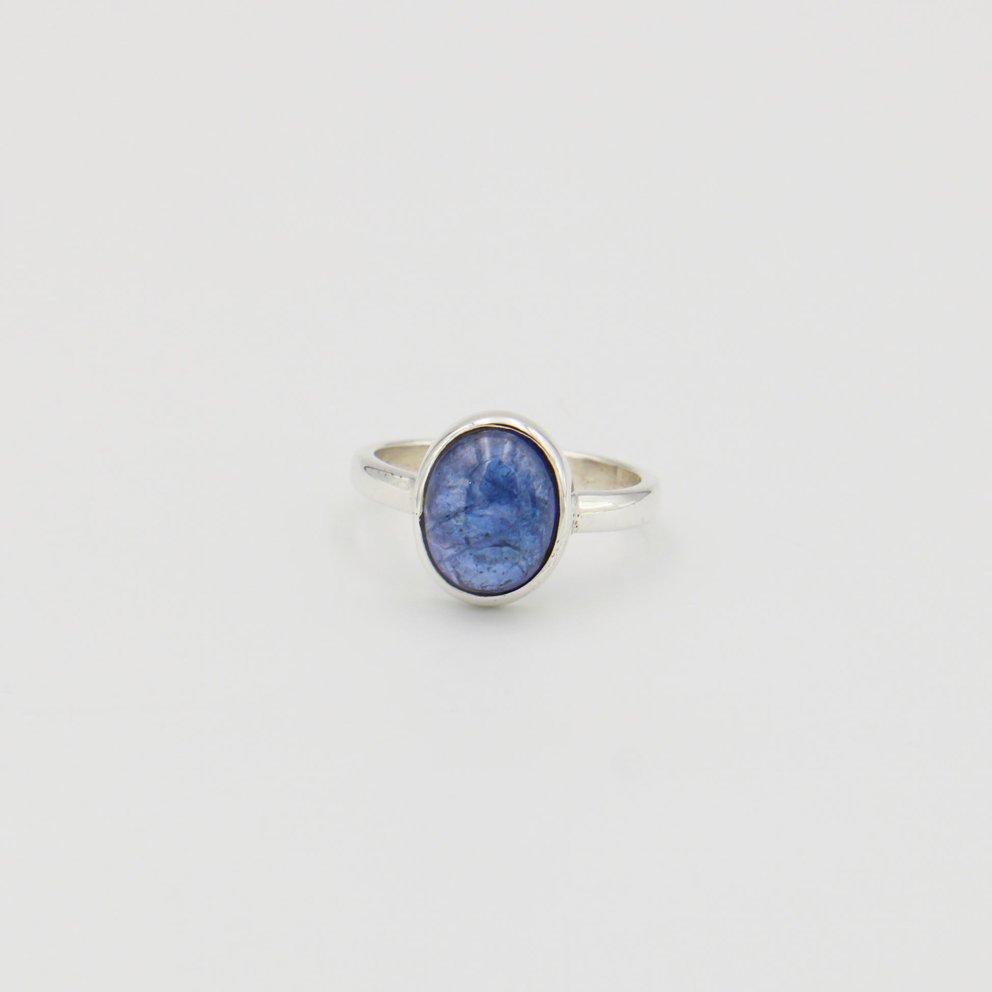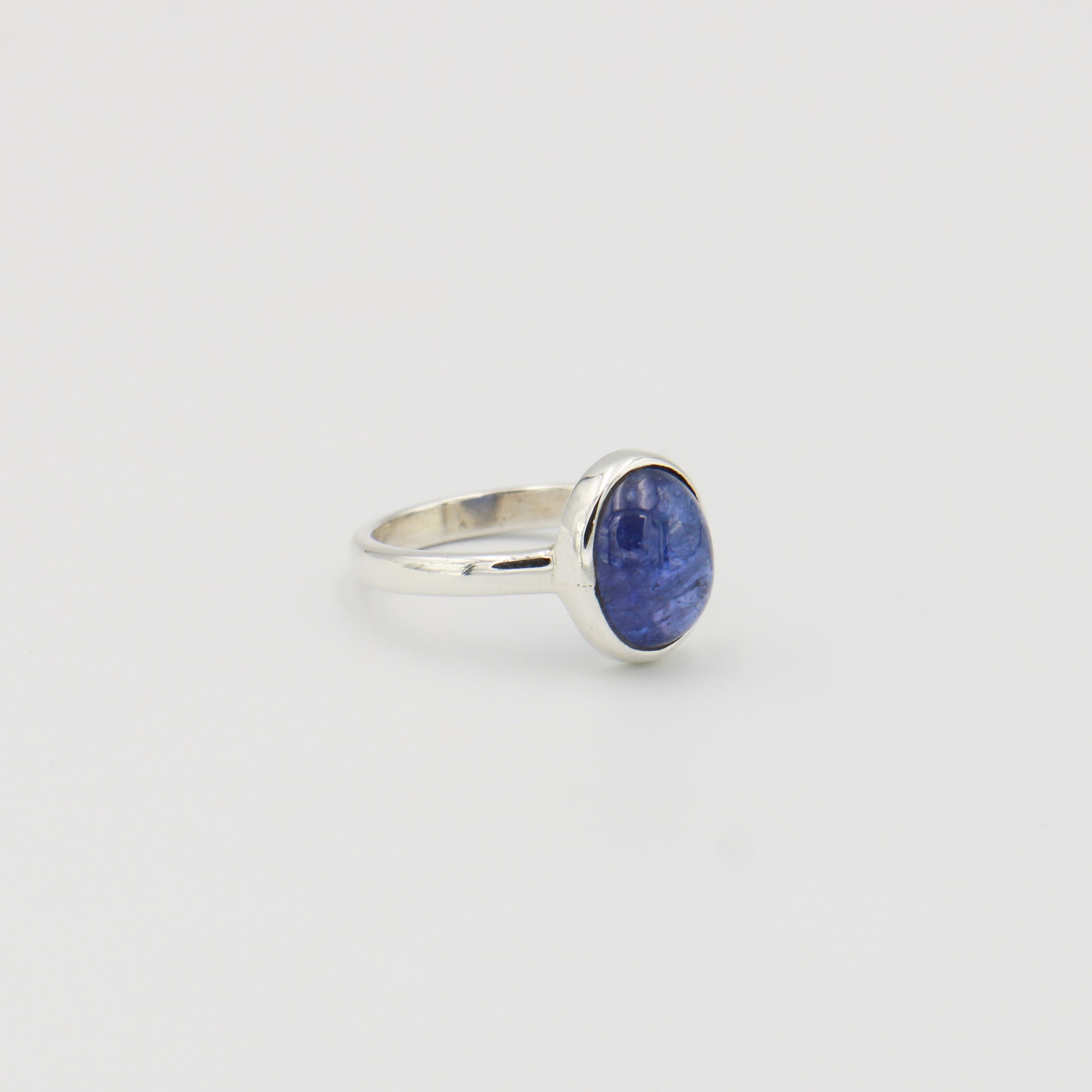 A striking tanzanite oval cabochon mounted in sterling silver. The deep blue stone showcases natural color variations and brilliant light play. Size 7. A classic piece that brings elegance and sophistication to any jewelry collection.