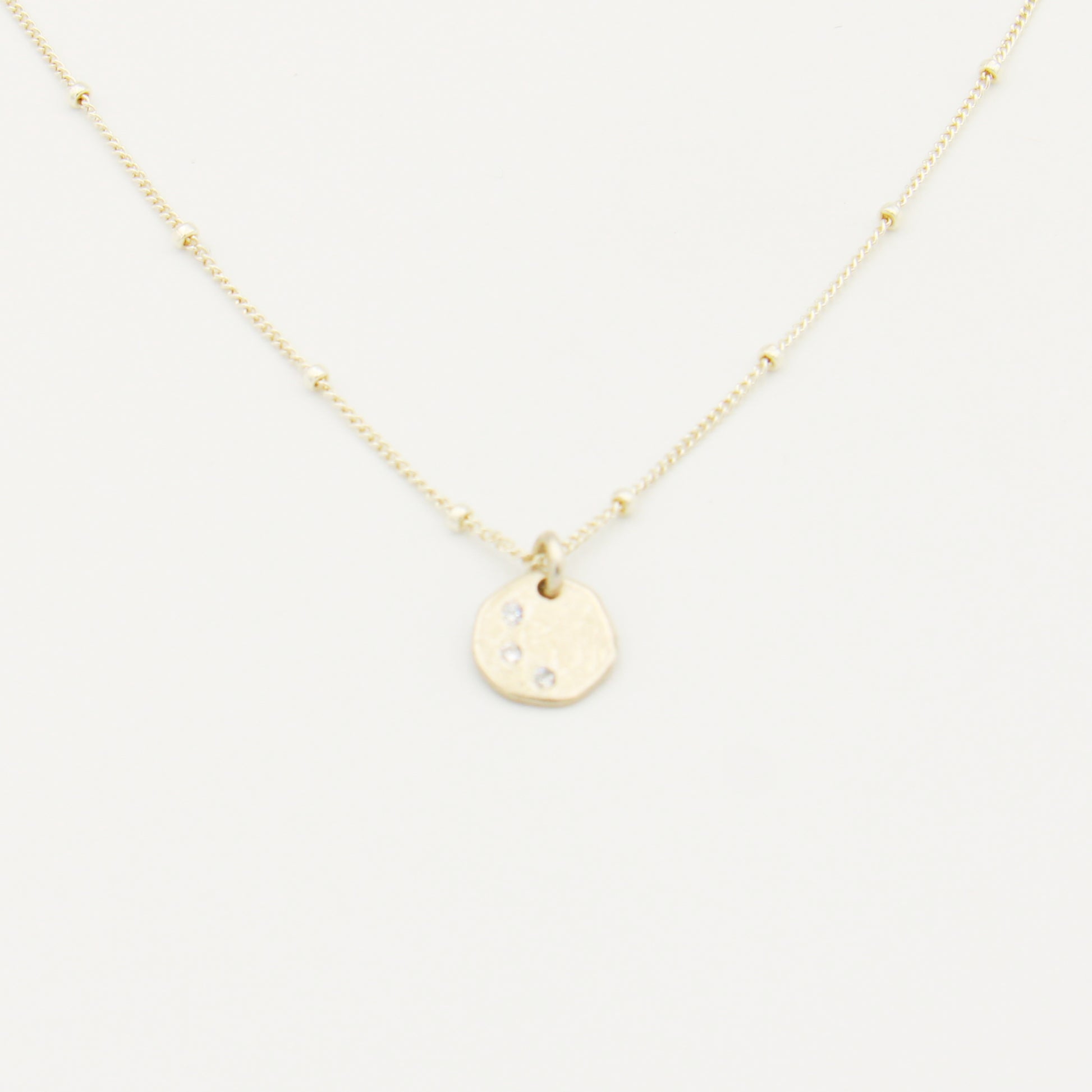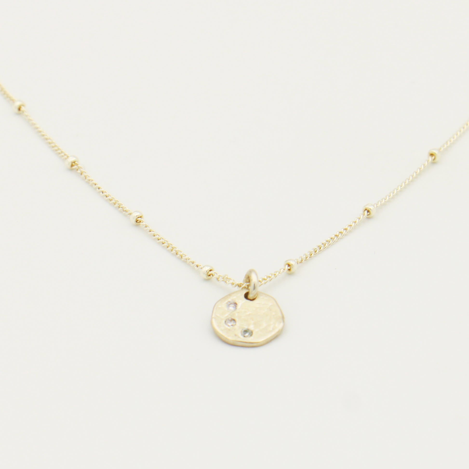 A petite disk featuring three tiny sparkles on a dainty, beaded 18" cable chain. Hand crafted in sterling silver