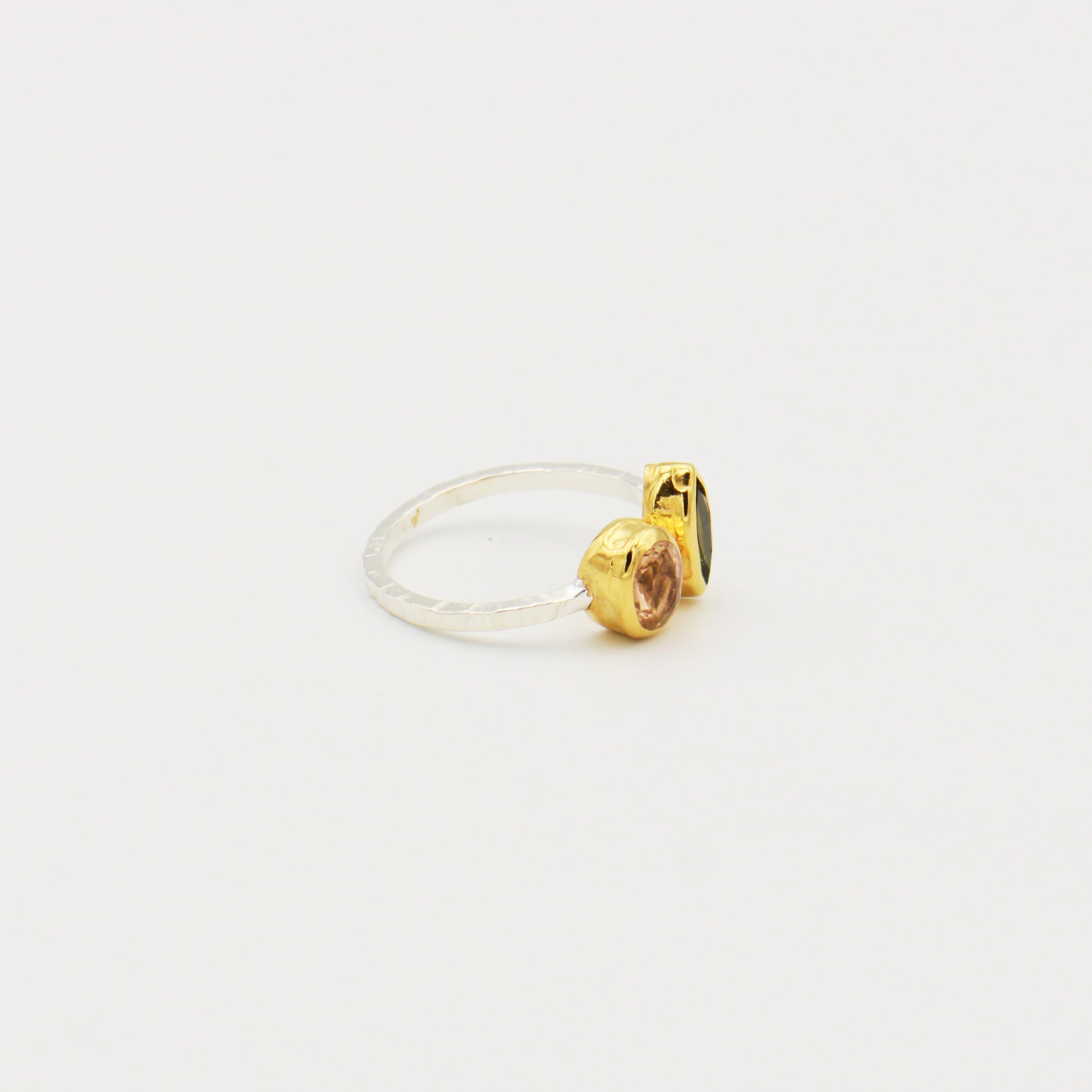 Pink tourmaline oval stone paired with a green tourmaline marquis stone creates this unique ring. The stones are set in GP bezels on top of a hammered sterling silver band. Size 7.