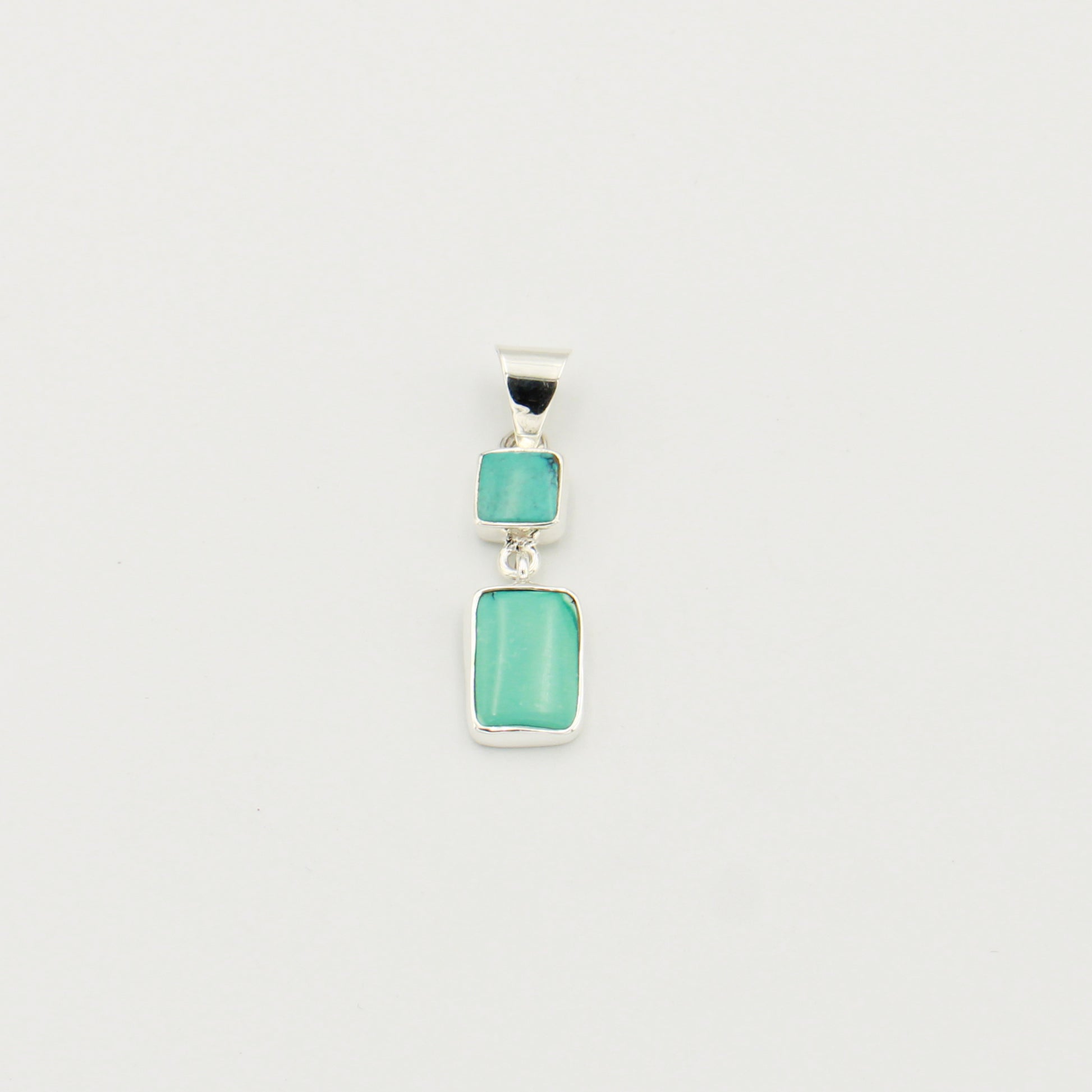 Elegant sterling silver pendant featuring two rectangular turquoise stones arranged in a striking double design. The polished silver setting complements the natural blue-green hues of the turquoise. Lightweight and versatile, this pendant pairs beautifully with any chain or cord.