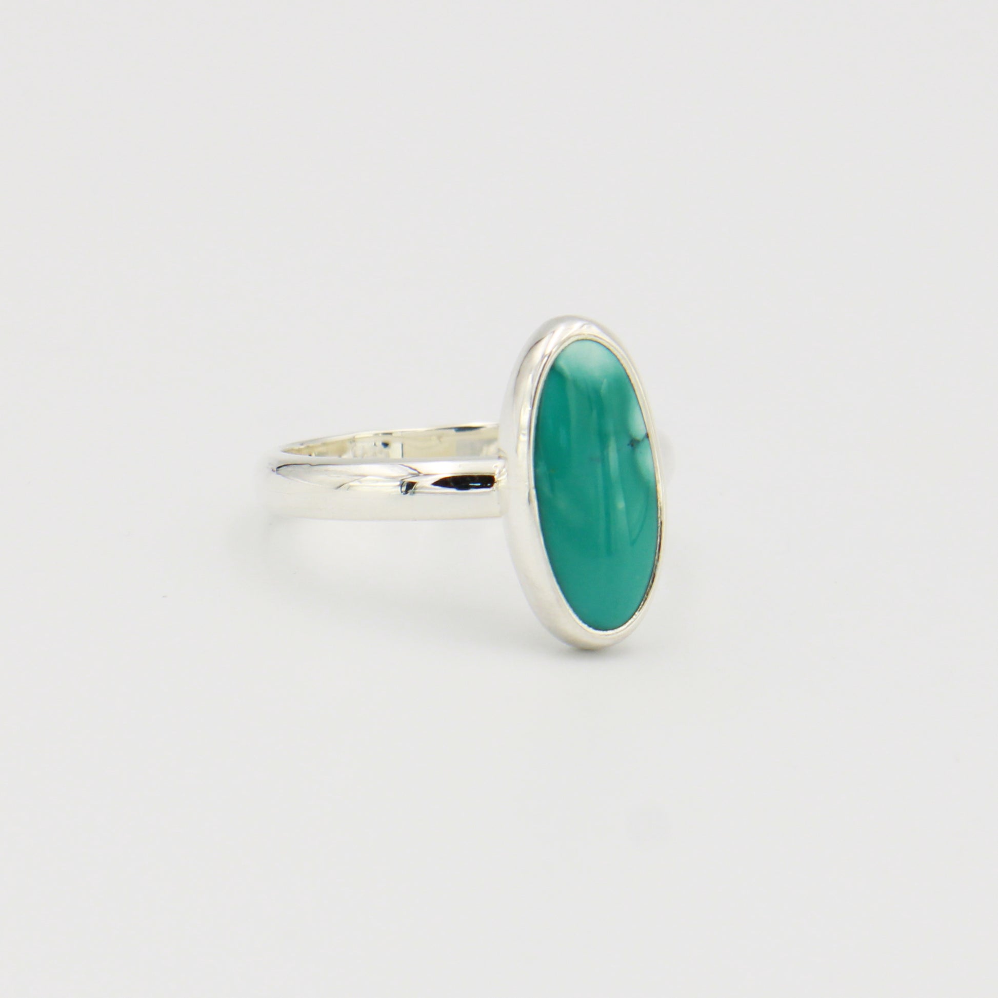 Striking turquoise stone set in a long oval design, crafted in sterling silver. This size 9 ring features a polished finish that highlights the natural beauty of the turquoise.