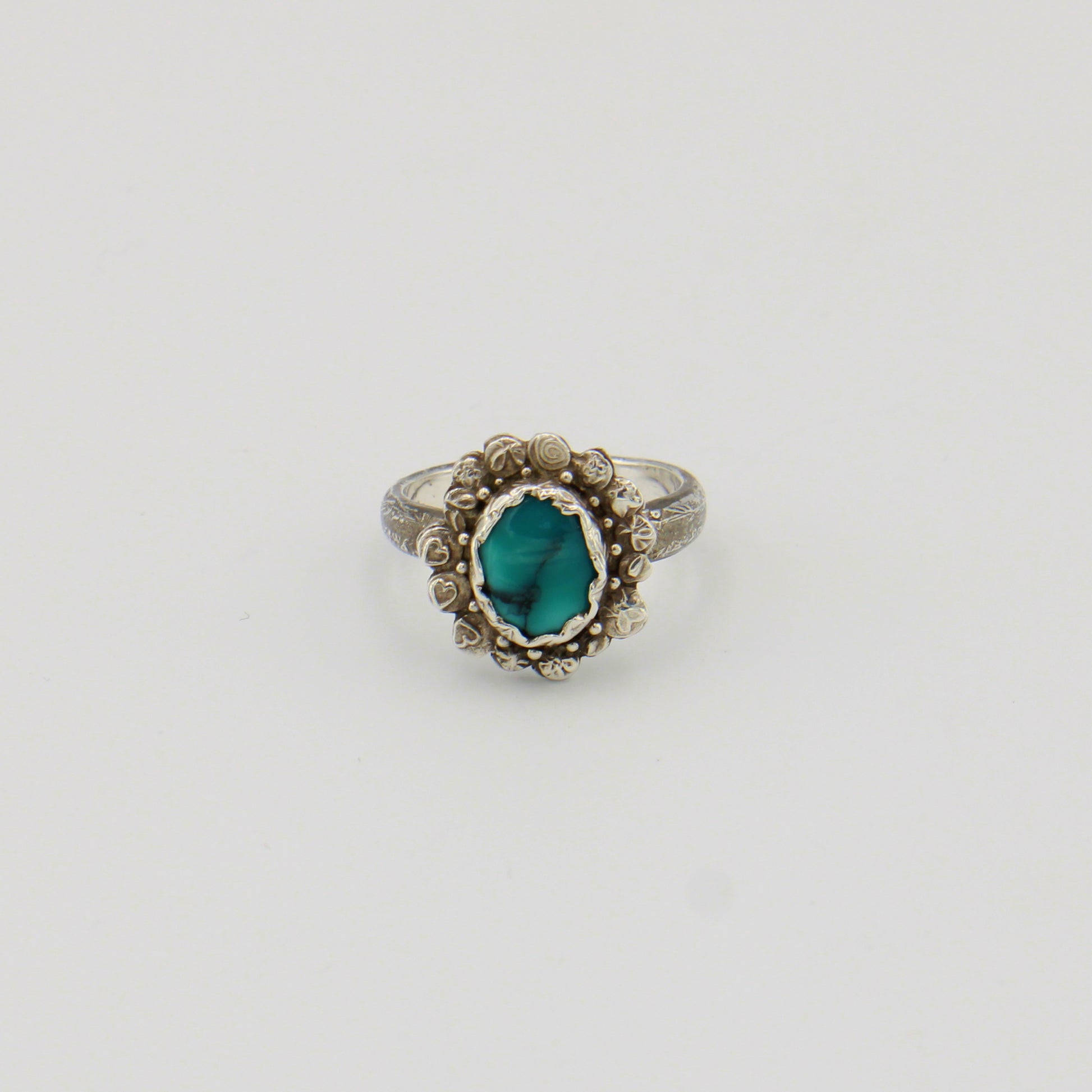 Turquoise stone set in a sterling silver band featuring hand-stamped flower detailing. This size 8 ring combines natural gemstone beauty with artisan metalwork for an understated, bohemian look.