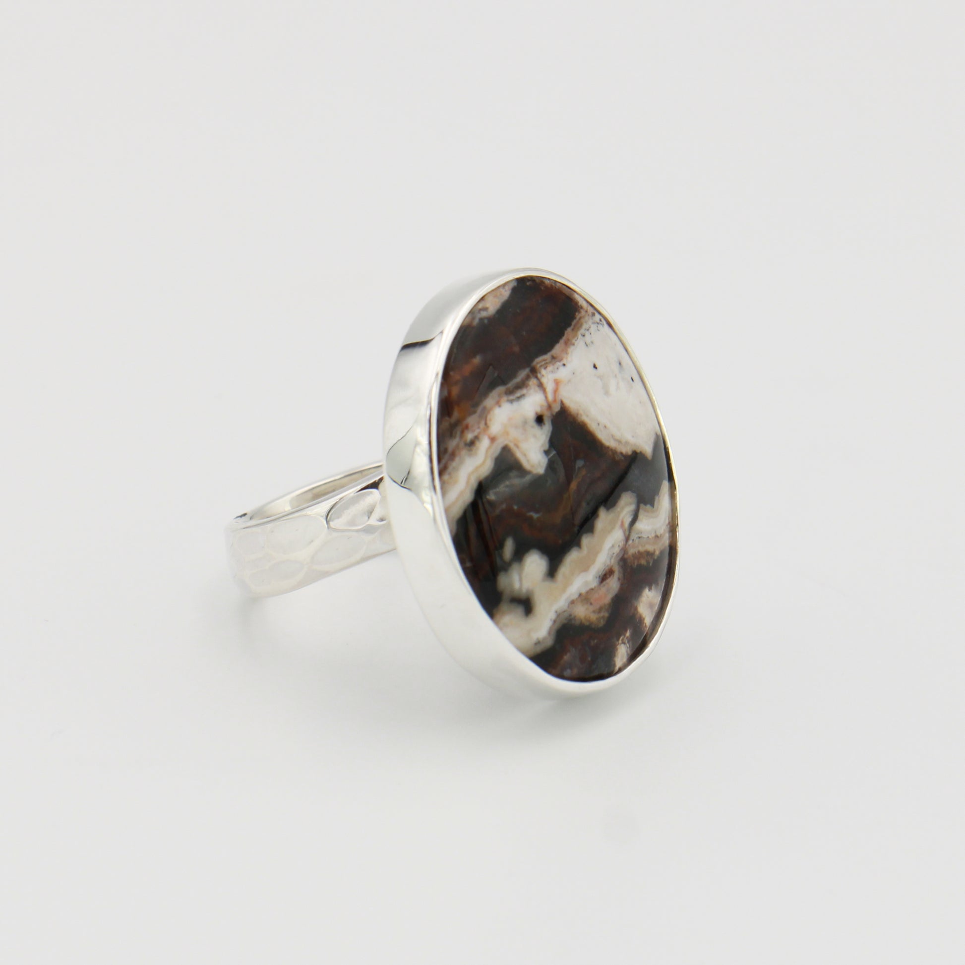 Verde Valley Agate Large Round Sterling Ring features a striking green and white banded stone set in a spacious round bezel. The adjustable sterling silver band ensures a comfortable fit for most sizes. Perfect for adding natural elegance to any outfit.