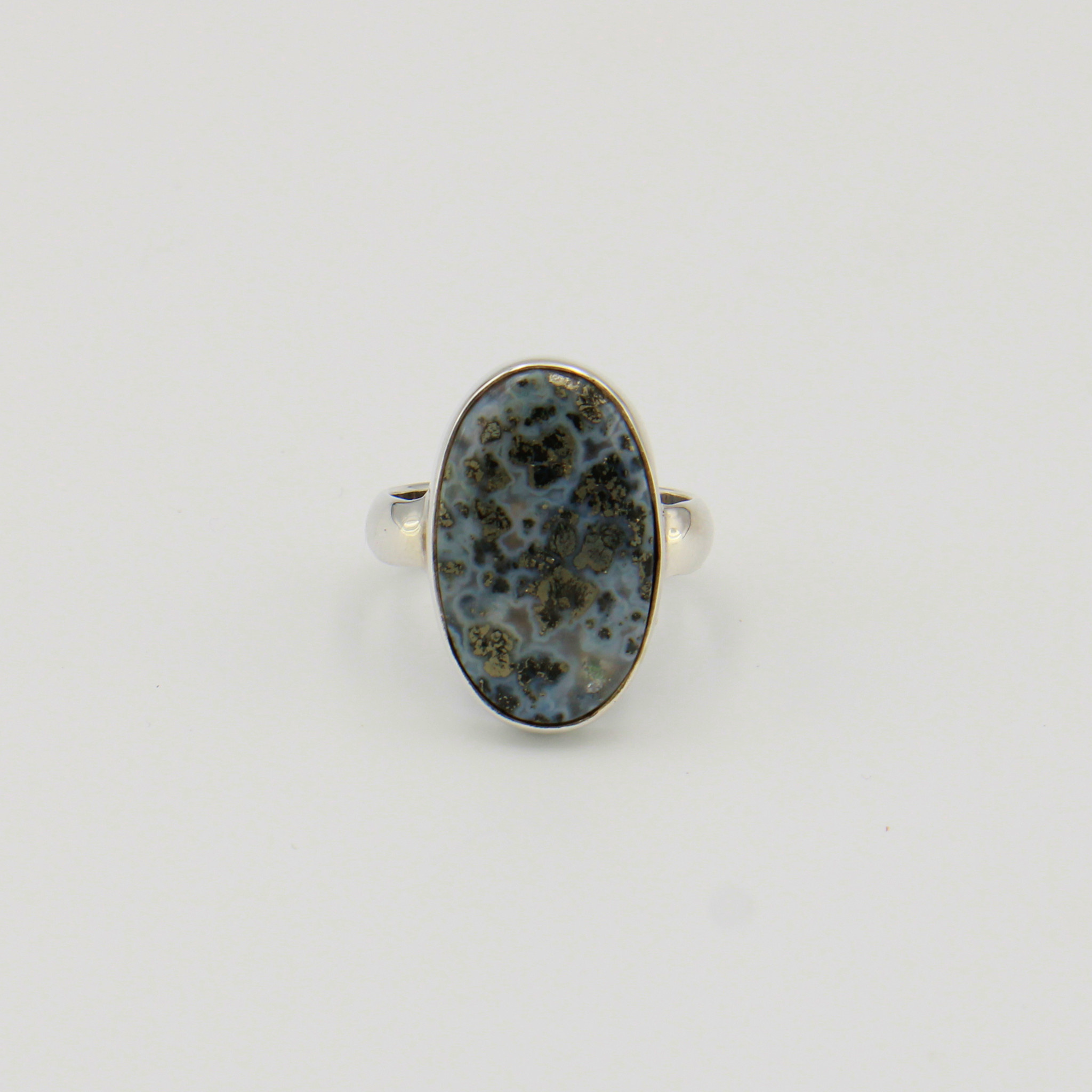 Swirls of Pyrite, Chalcedony and other minerals compose this mesmerizing Pyrite in Agate Stone. Sterling silver, size 8.