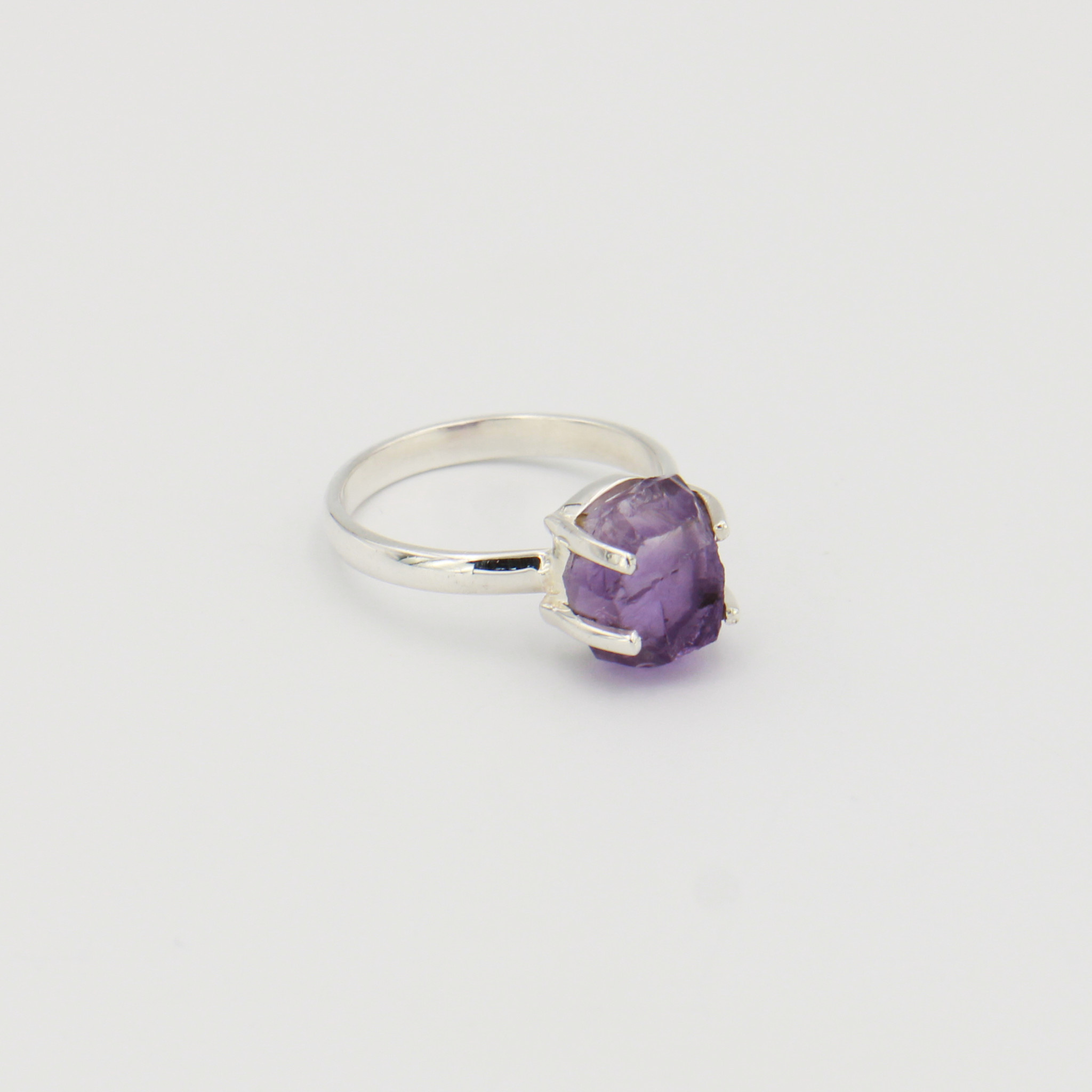 This mesmerizing raw Amethyst is prong set in sterling silver. Simple and eye-catching. Size 8
