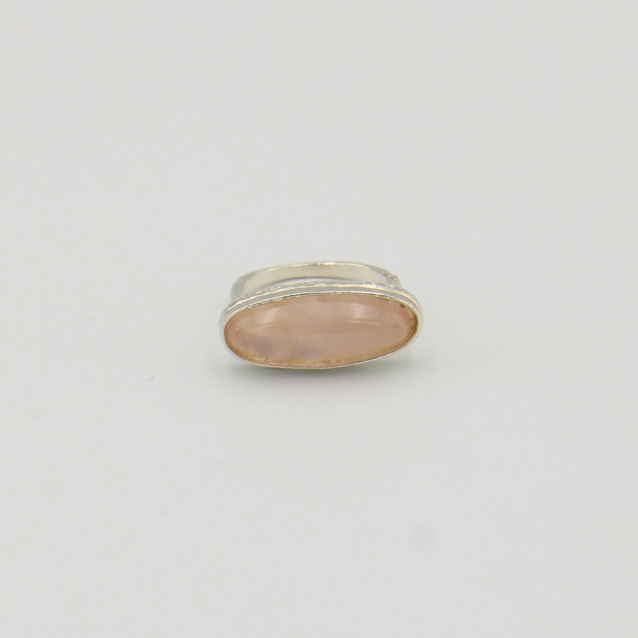 The horizontal positioning of this Rose Quartz ring is flattering and modern. Textured sterling silver.