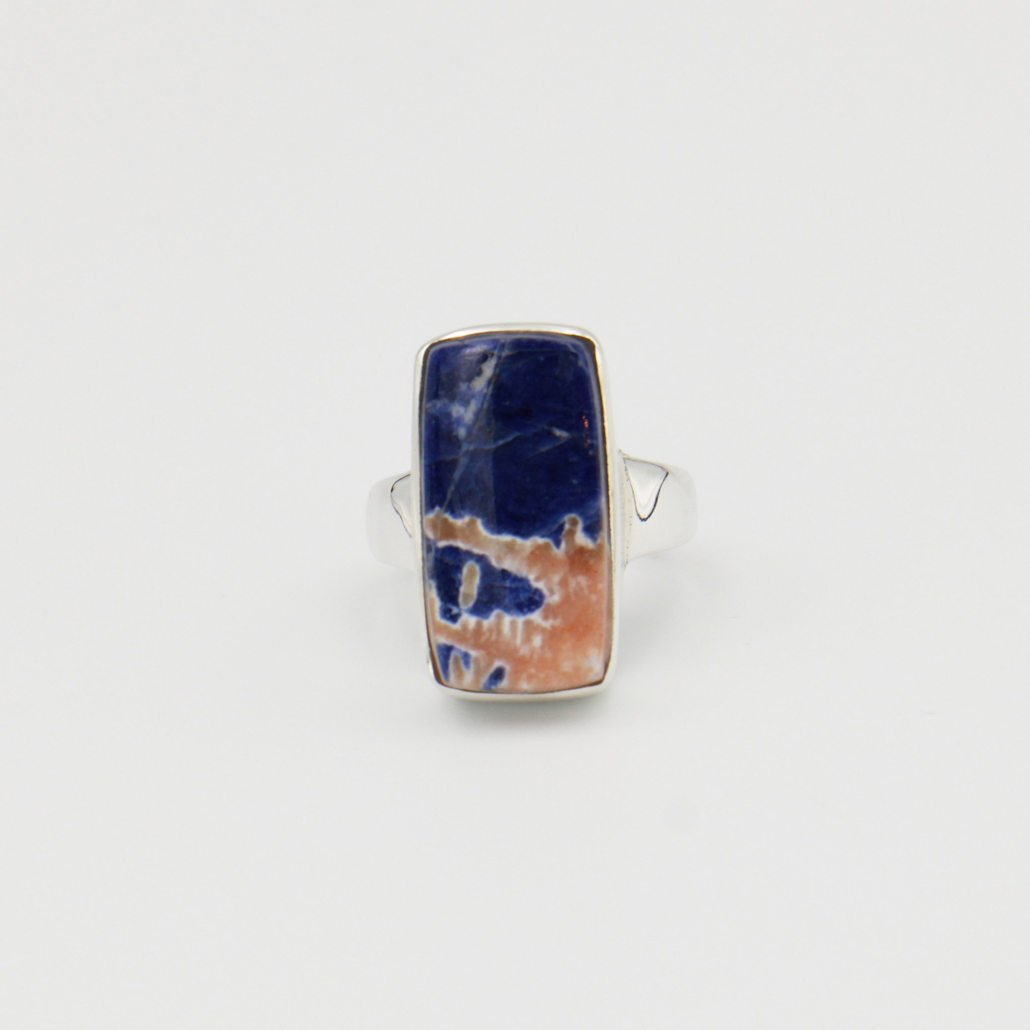 This beautiful Sodalite ring is handmade in sterling silver, and features a rectangular stone. Size 7.5